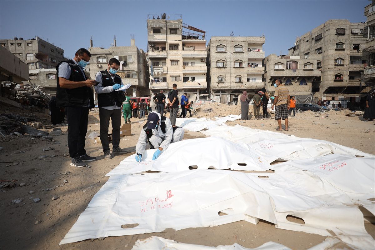Gazze Şehri’nin kuzeybatısındaki Şeyh Radwan Kliniği avlusuna gömülen 35 kişinin cenazesi mezardan alınarak kimlik tespiti için Şifa Hastanesi’ne sevk edildi.