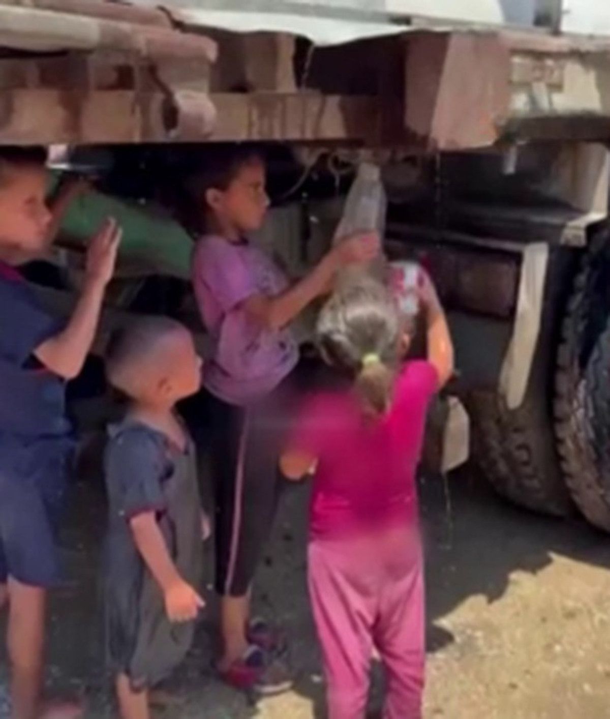 Gazzeli çocuklar suya ulaşmak için su taşıyan bir kamyondan akan kirli suyu ellerindeki kaplara doldururken görüldü.