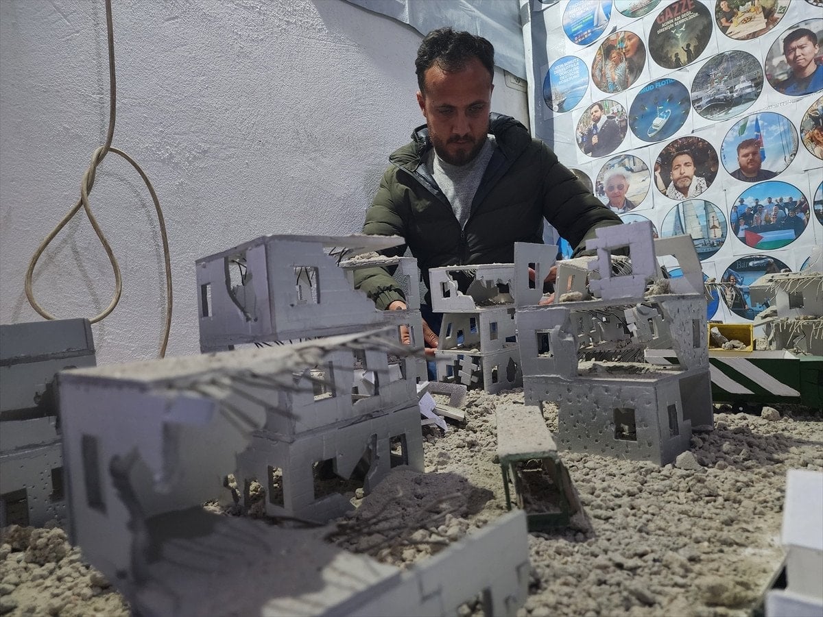 Gazze’nin güneyindeki Han Yunus kentinde yaşayan Muhammed en-Neccar, Yezin Şahin ve Vaad el-Hams, İsrail saldırılarının izlerini taşıyan maketler hazırlıyor. Çalışmalarda, bombardımandan kaçan sivilleri taşıyan araçlar, ambulanslar, sahra hastaneleri, sivil savunma ekipleri ve havadan yardım atan askeri kargo uçakları gibi detaylar yer alıyor.