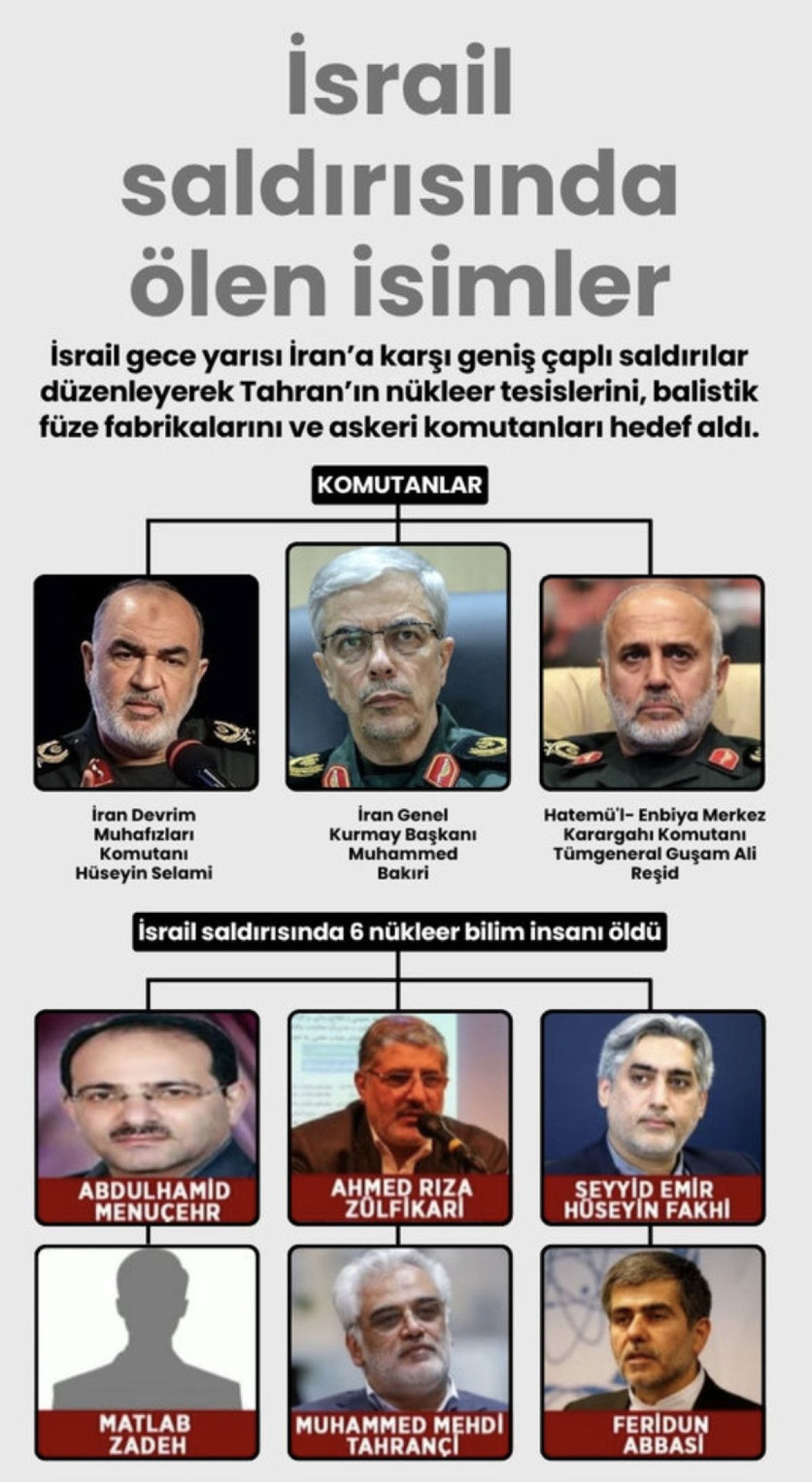 Saldırılarda İran’ın en büyük kaybı en üst düzey iki komutanı olan İran Devrim Muhafızları Komutanı Hüseyin Selami ve İran Genelkurmay Başkanı Tümgeneral Muhammed Bakıri olurken, 6 nükleer bilimcinin de hayatını kaybettiği açıklandı.
