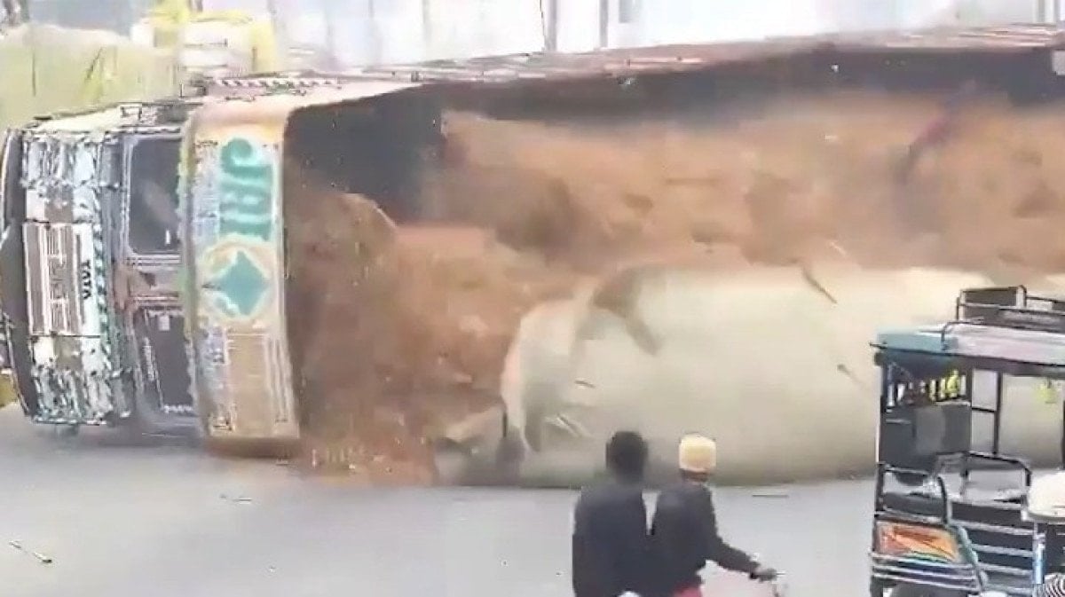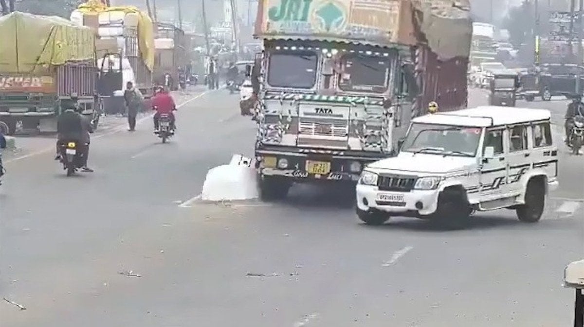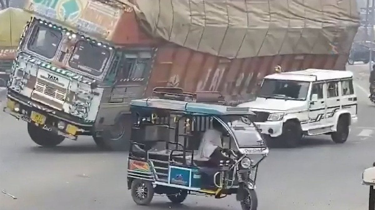 Hindistan’ın Uttar Pradesh eyaletine bağlı Rampur’da talaş yüklü kamyon, dönüş yapmaya çalışan ciple çarpışmamak için ani manevra yaptı.