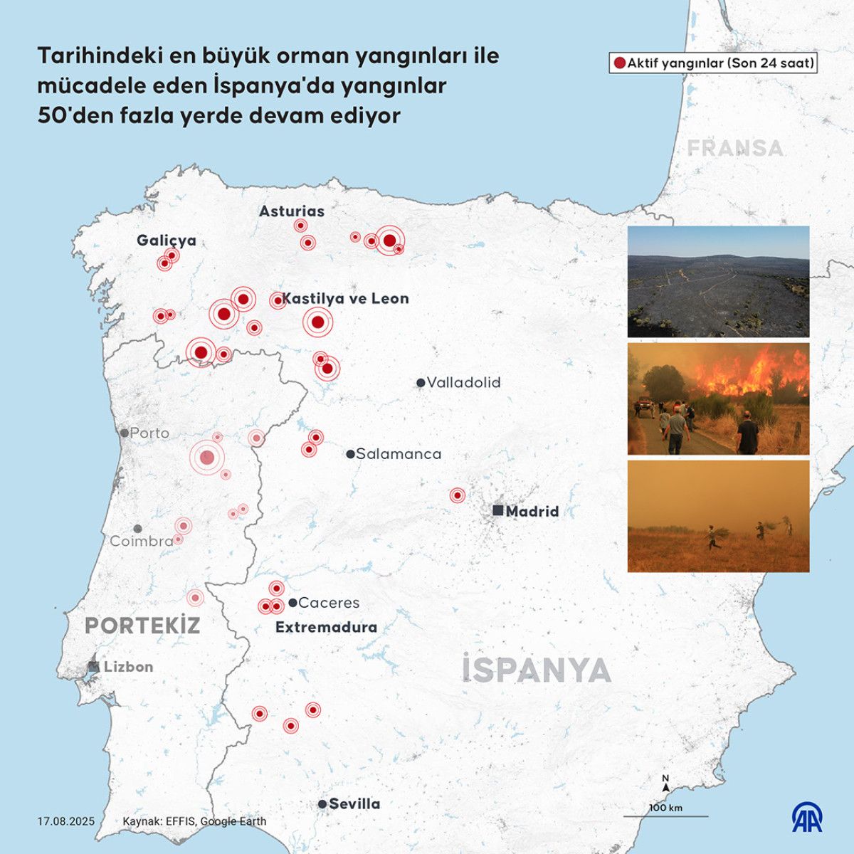 Resmi haber ajansı EFE’nin yerel yönetim kaynaklarına dayandırdığı bilgilere göre, kuzeyde Kastilya ve Leon’da 25, Galiçya’da 14, Asturias’ta 12, güneyde ise özellikle Extremadura bölgesinde yangınlar sürüyor. En yoğun yangınların Ourense (Galiçya), Leon ve Zamora (Kastilya ve Leon), Somiedo Doğal Parkı (Asturias) ve Plasencia (Extremadura) bölgelerinde olduğu belirtiliyor.