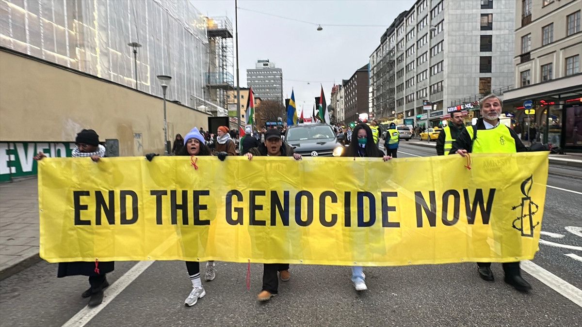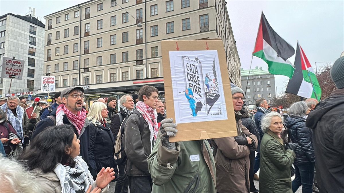 “Gazze’de çocuklar öldürülüyor”, “Okullar ve hastaneler bombalanıyor”, “Lübnan’a saldırı durdurulsun” ve “Gıda kıtlığına son verilsin” yazılı pankartlar taşıyan topluluk, İsrail’in Gazze’ye yönelik soykırımı ve Lübnan’a yapılan hava saldırısını durdurmasını ve İsveç’in İsrail’e silah satışına son vermesini talep etti.