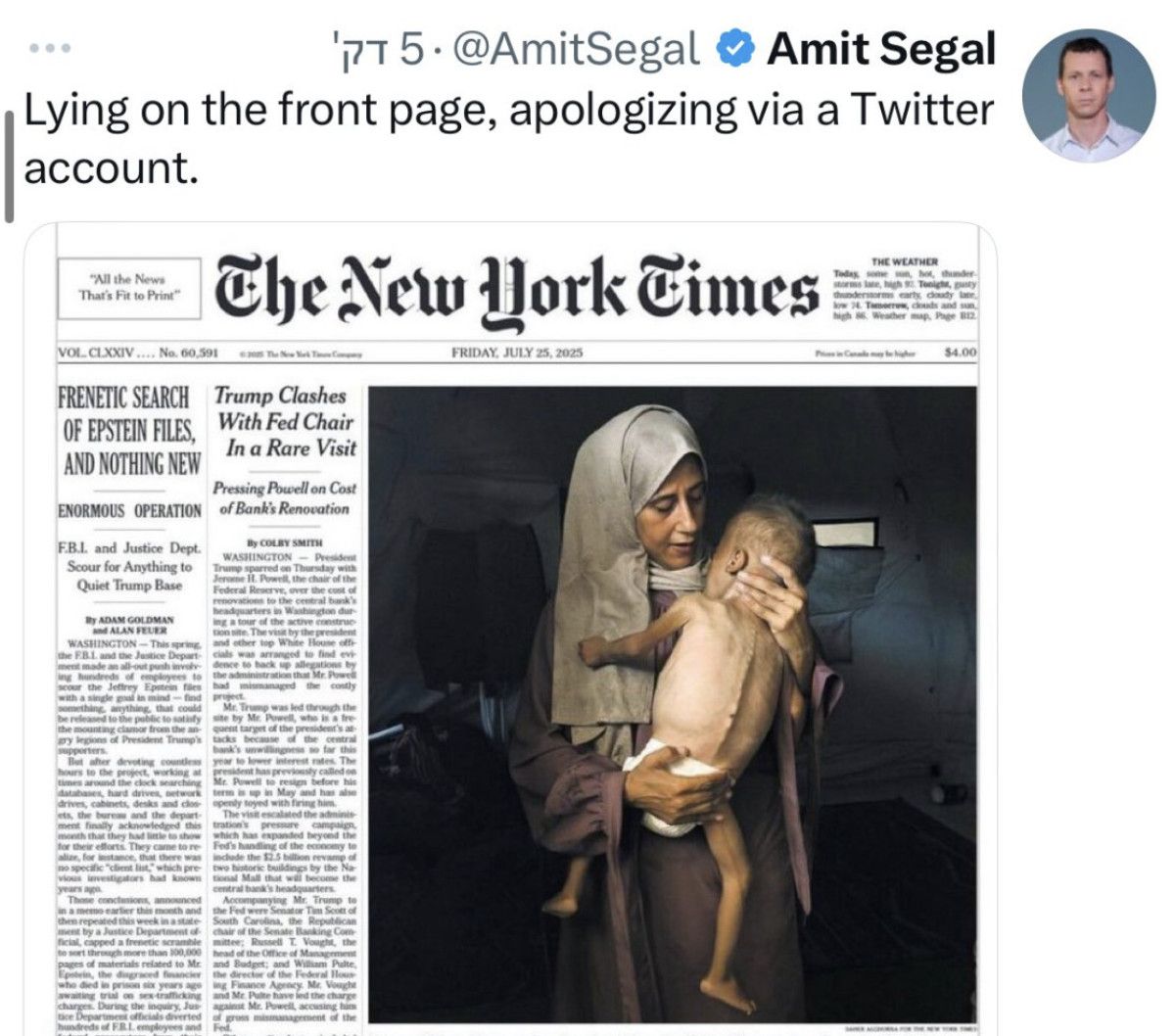 NYT’nin bu görüntüyü manşete taşıması, Batı medyasındaki suskunluğu kırarken, İsrail yönetiminde ise öfkeye yol açtı.