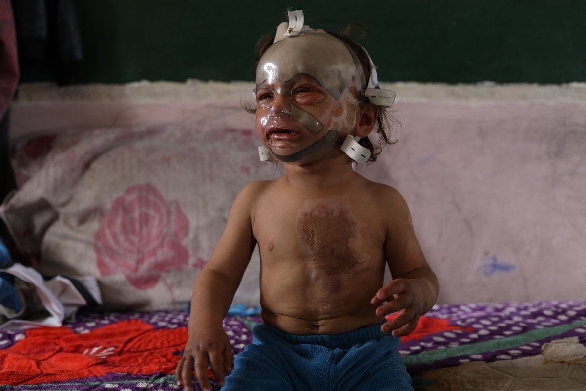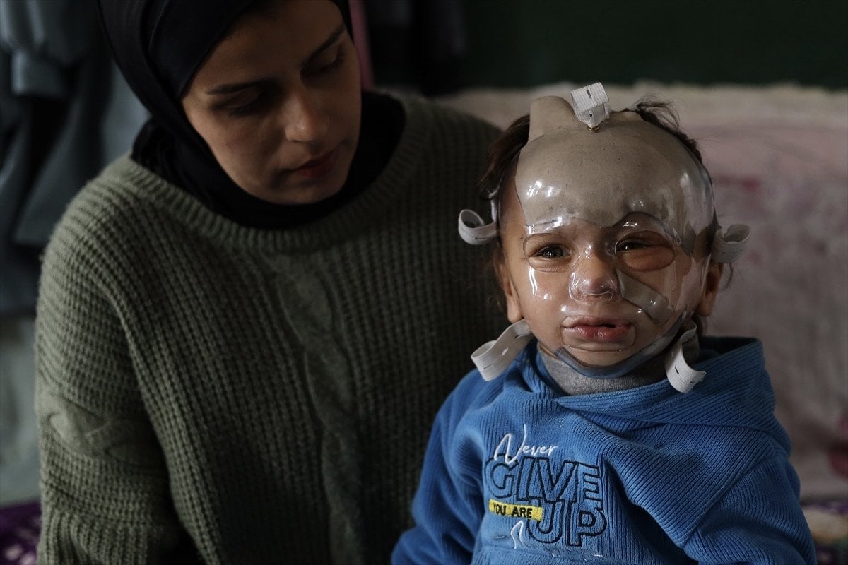Doktorlar, yanıklara bağlı olarak yüz dokusunun kontrolsüz şekilde genişlemesini önlemek amacıyla çocuğa plastik basınç maskesi taktı.