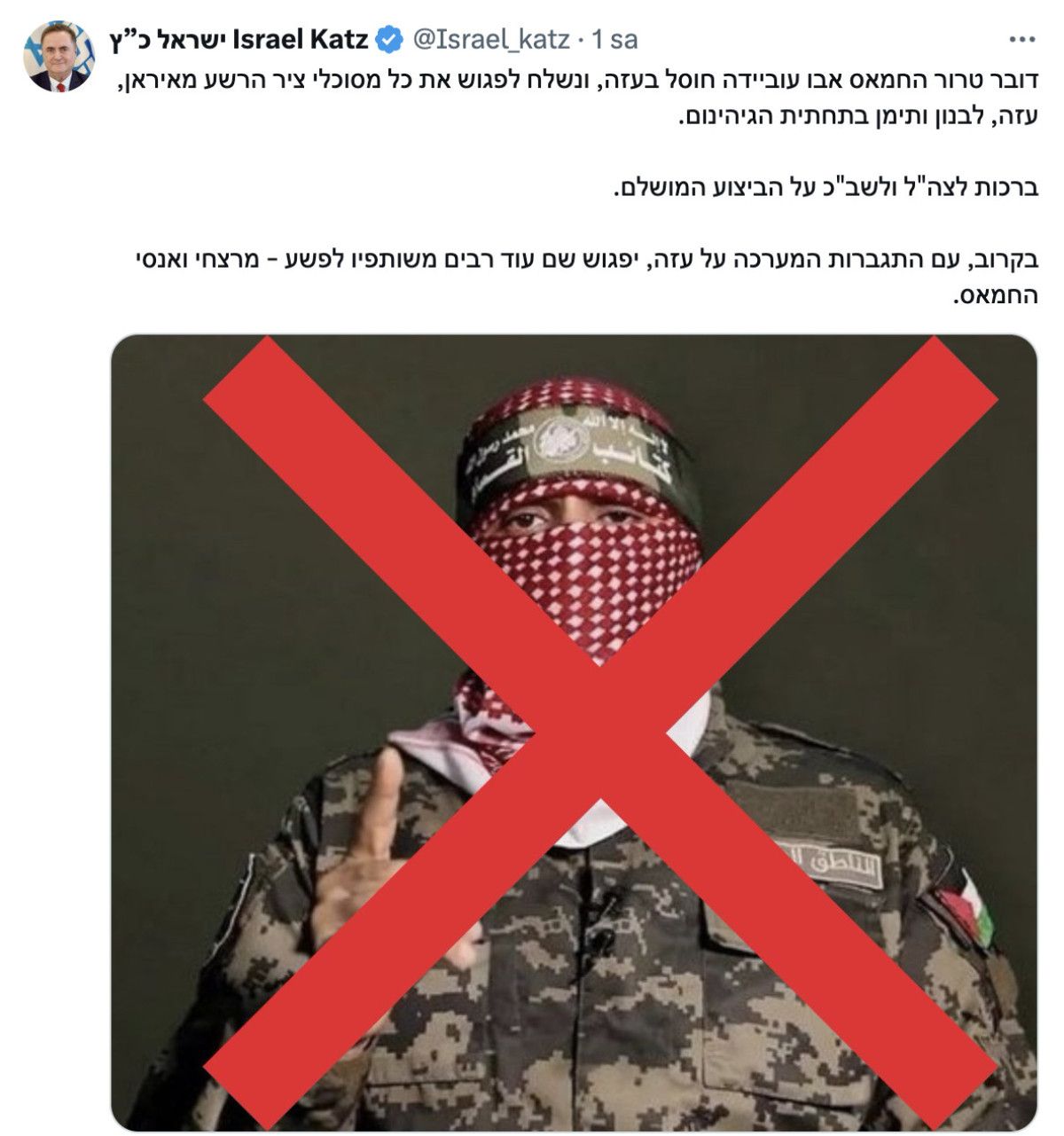 İsrail Savunma Bakanı Yisrael Katz, ABD merkezli X sosyal medya platformundaki hesabından yaptığı paylaşımda, fotoğrafını paylaştığı Kassam Tugayları Sözcüsü Ebu Ubeyde’yi öldürdüklerini savundu.