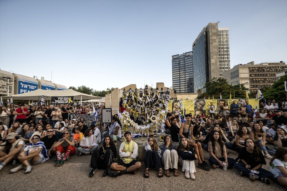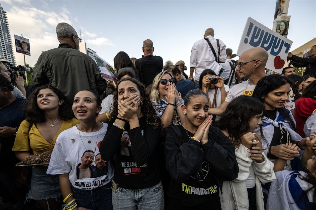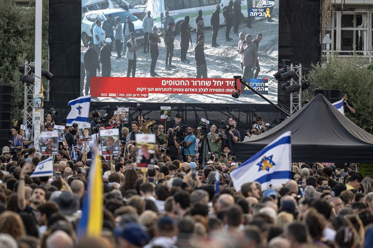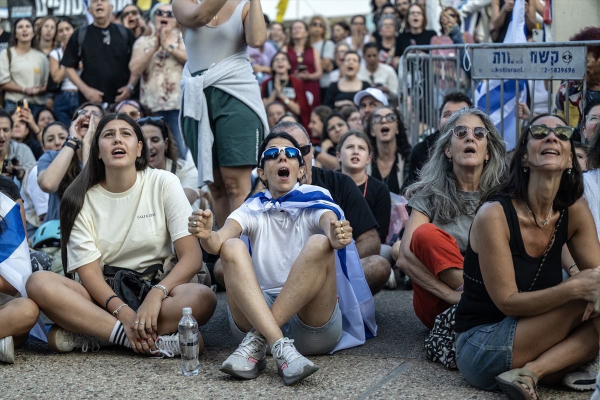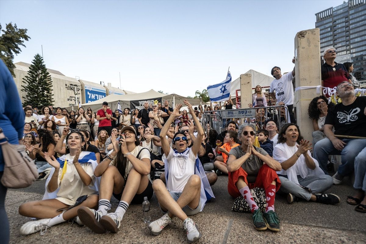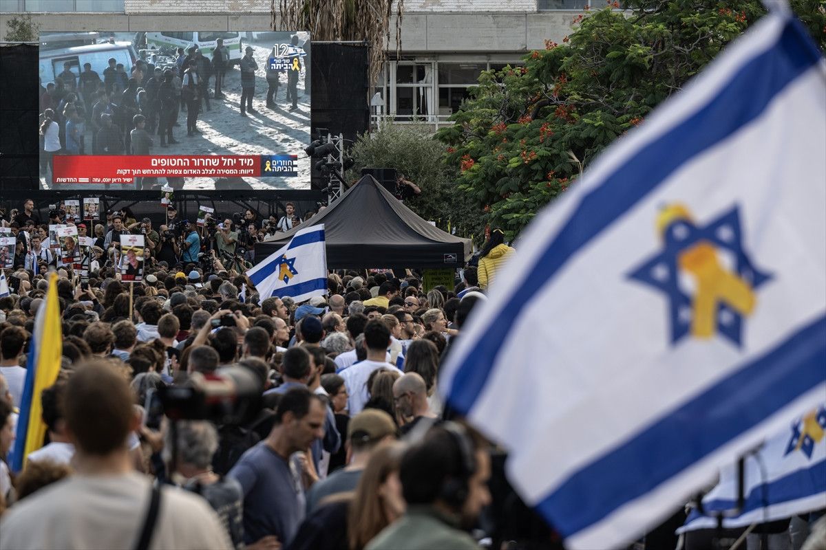 Filistin topraklarını gasbeden İsrailliler, Gazze’de yürürlüğe giren ateşkes anlaşması sonrası gerçekleşecek esir takasını Tel Aviv’de kurulan ekranlardan takip etti.