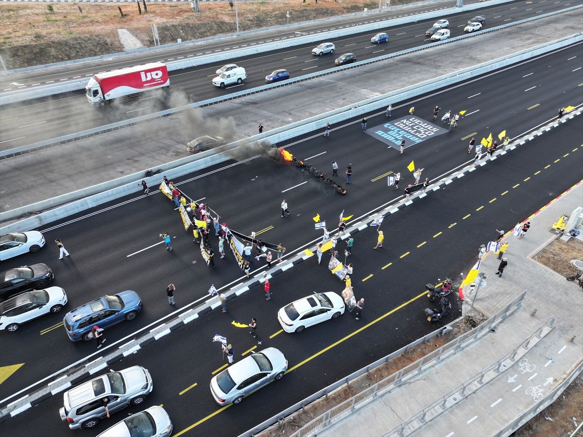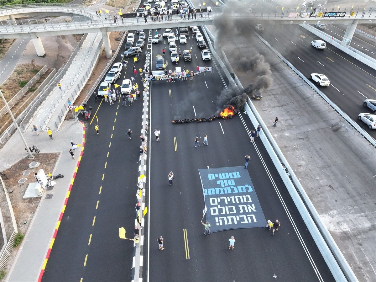 Göstericiler, ellerinde taşıdıkları pankartlarla Tel Aviv’deki 4. Cadde’yi trafiğe kapatarak Gazze’de bulunan İsraillilerin serbest bırakılması için anlaşmaya varılmasını talep etti.