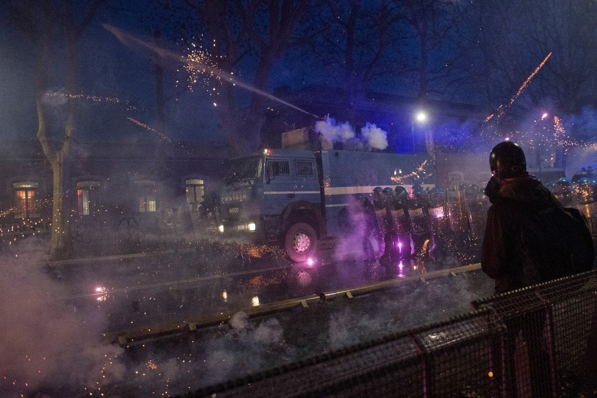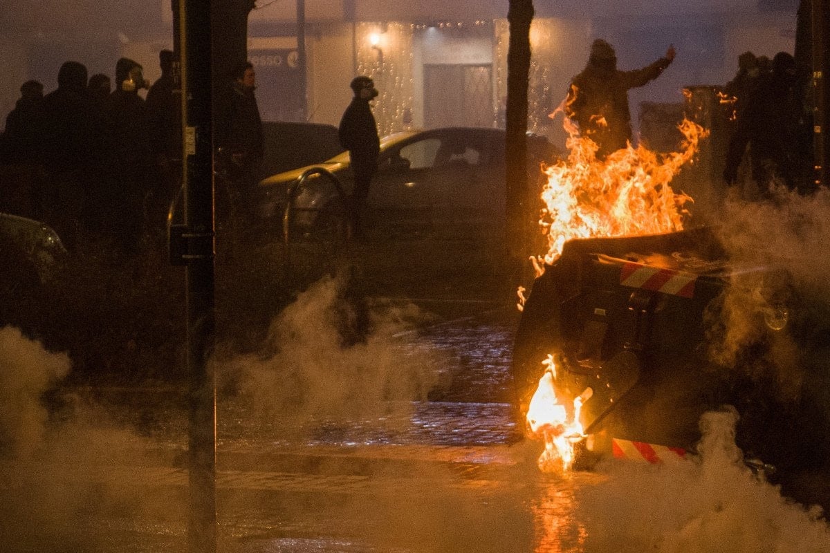 Bir polis minibüsü ve çok sayıda çöp kutusunun ateşe verildiği gösteride, sokaklar savaş alanına döndü.