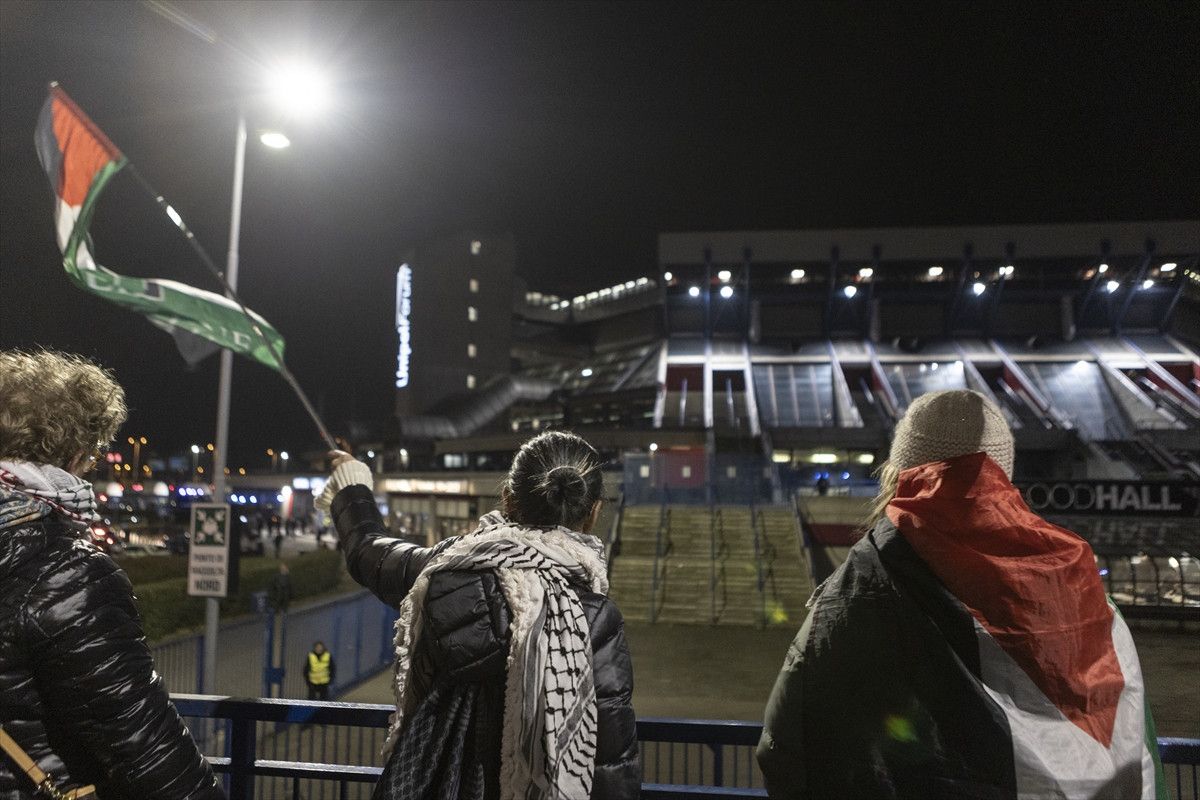 Ulusal basına yansıyan bilgi ve görüntülere göre, protestocular, “İsrail’e kırmızı kart göster” dövizi açarak, Gazze’de Filistinlilere karşı soykırım yapan İsrail’in spor müsabakalarından men edilmesini istedi.