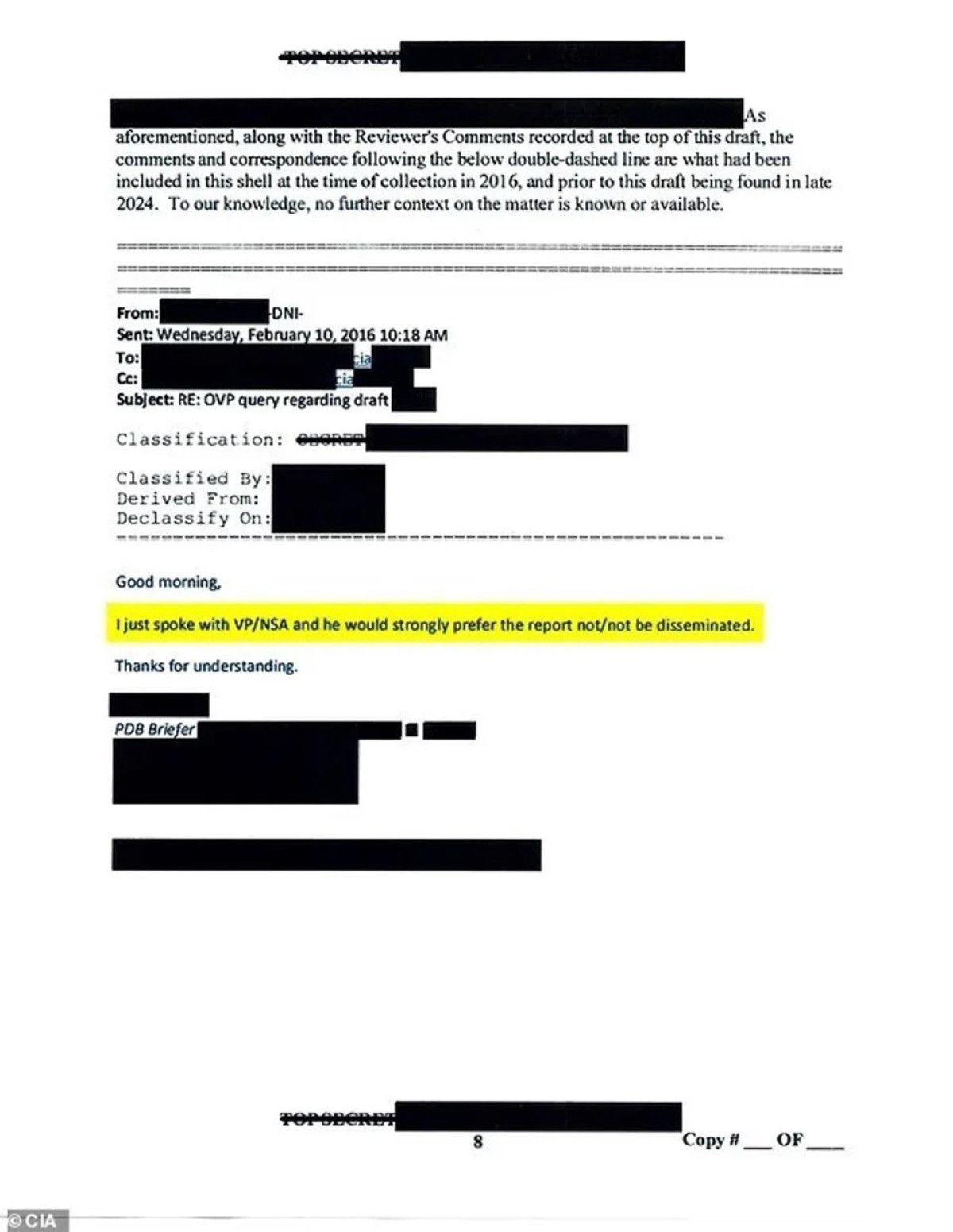 CIA tarafından gizliliği kaldırılan belgede sarı işaretli kısımda, “Az önce Başkan Yardımcısı/Ulusal Güvenlik Danışmanı ile konuştum ve raporun kesinlikle yayımlanmamasını güçlü bir şekilde tercih ettiğini belirtti” notu yer alıyor.
