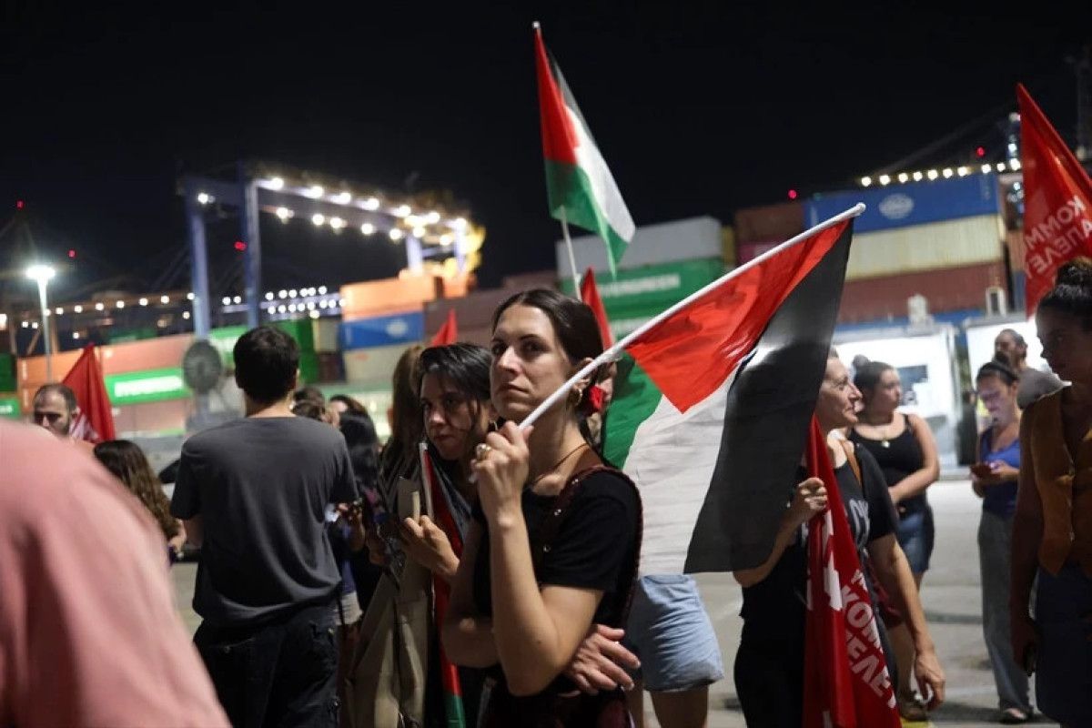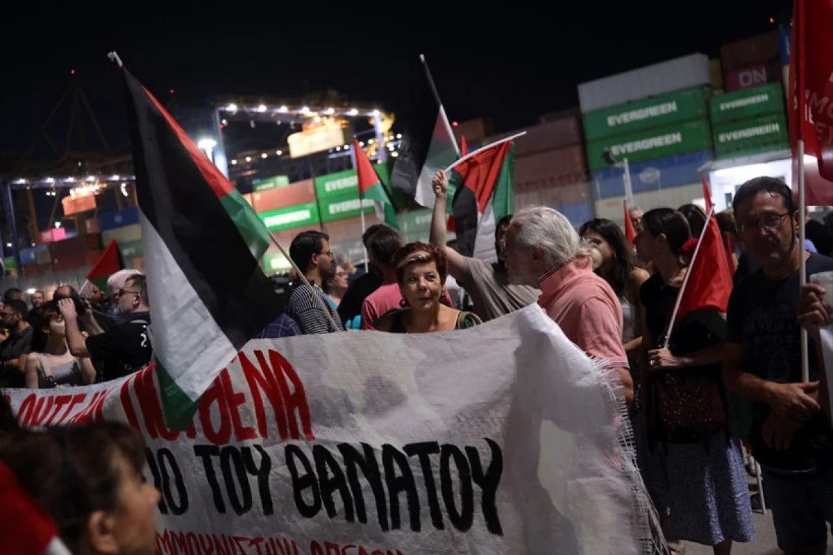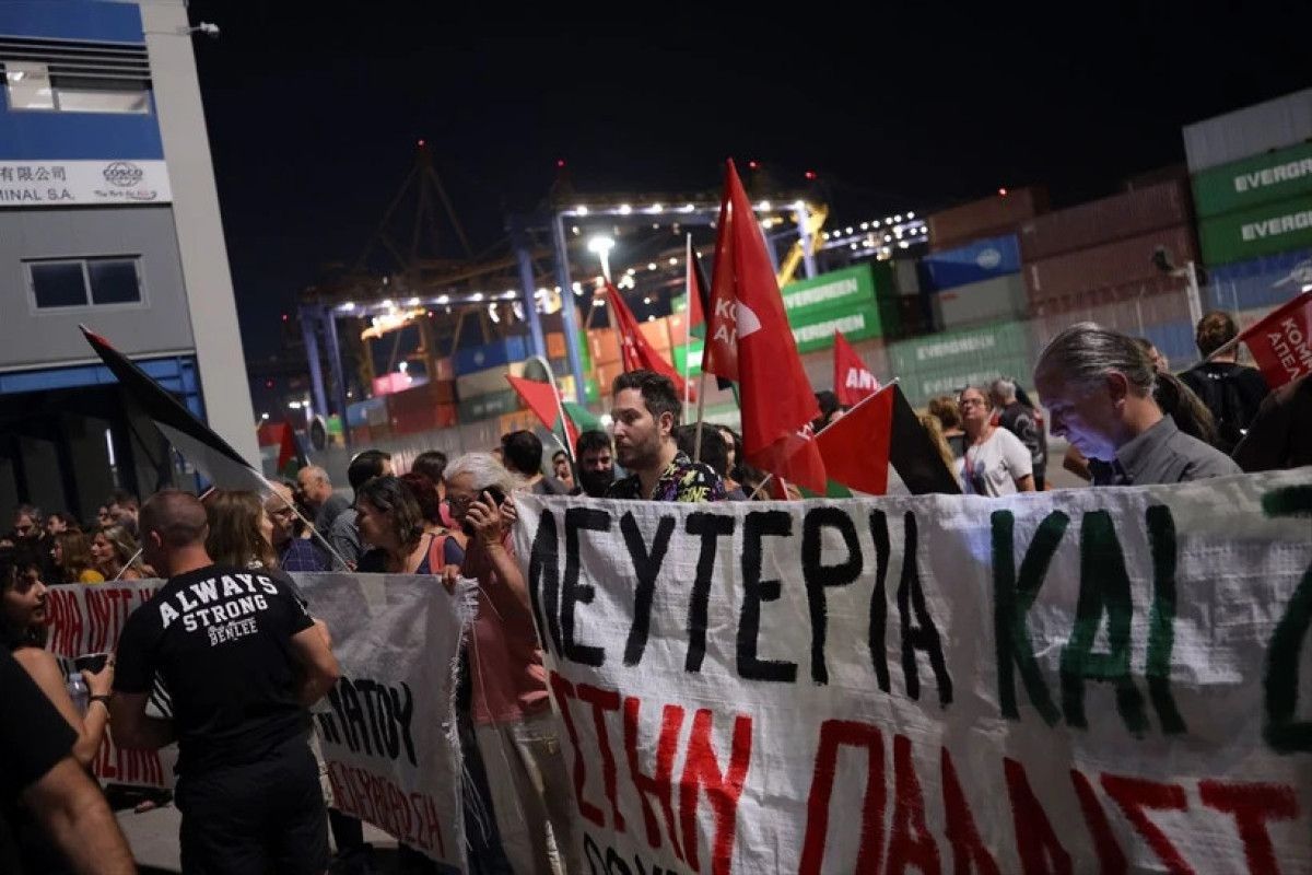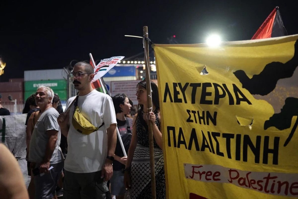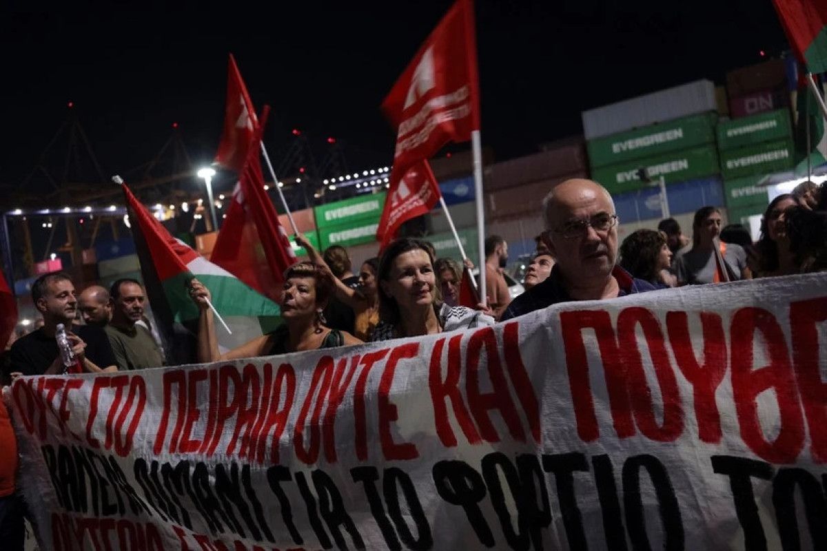 Yunanistan Konteyner Taşımacılığı İşçileri Birliği (ENEDEP), Yunanistan Komünist Partisine (KKE) bağlı İşçi Sendikası (PAME) ve Pire İşçileri Birliği’nin ortak çağrısıyla düzenlenen eyleme, Gazze’ye destek vermek isteyen işçi ve sendikalıların yanı sıra öğrenciler katıldı.