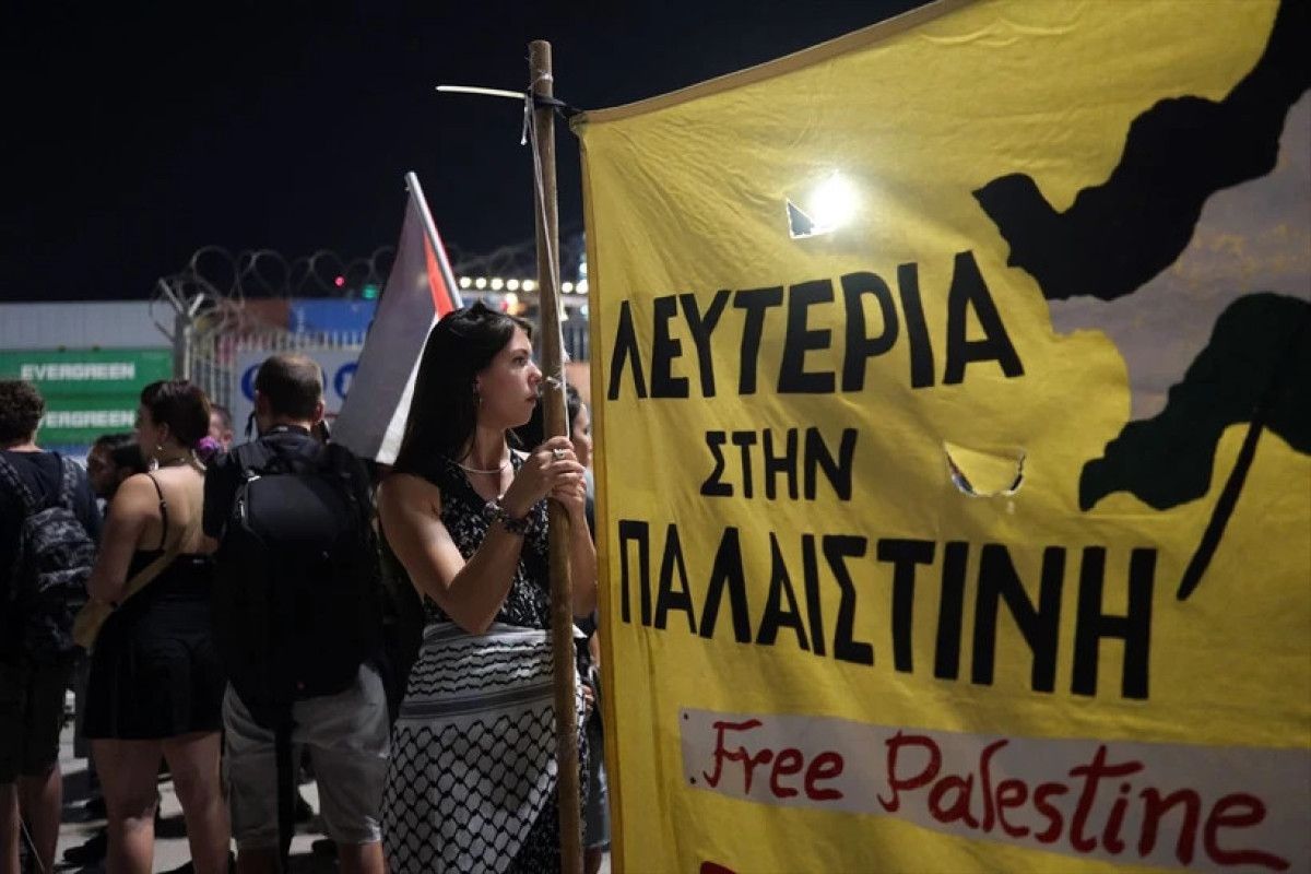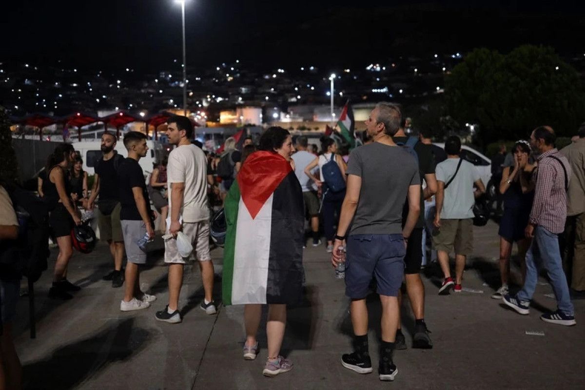 Pire Limanı’nda “Filistin’e özgürlük” sloganı atan eylemciler, askeri amaçla kullanılacak demir çeliğin İsrail’e gönderilmesine karşı çıktı.