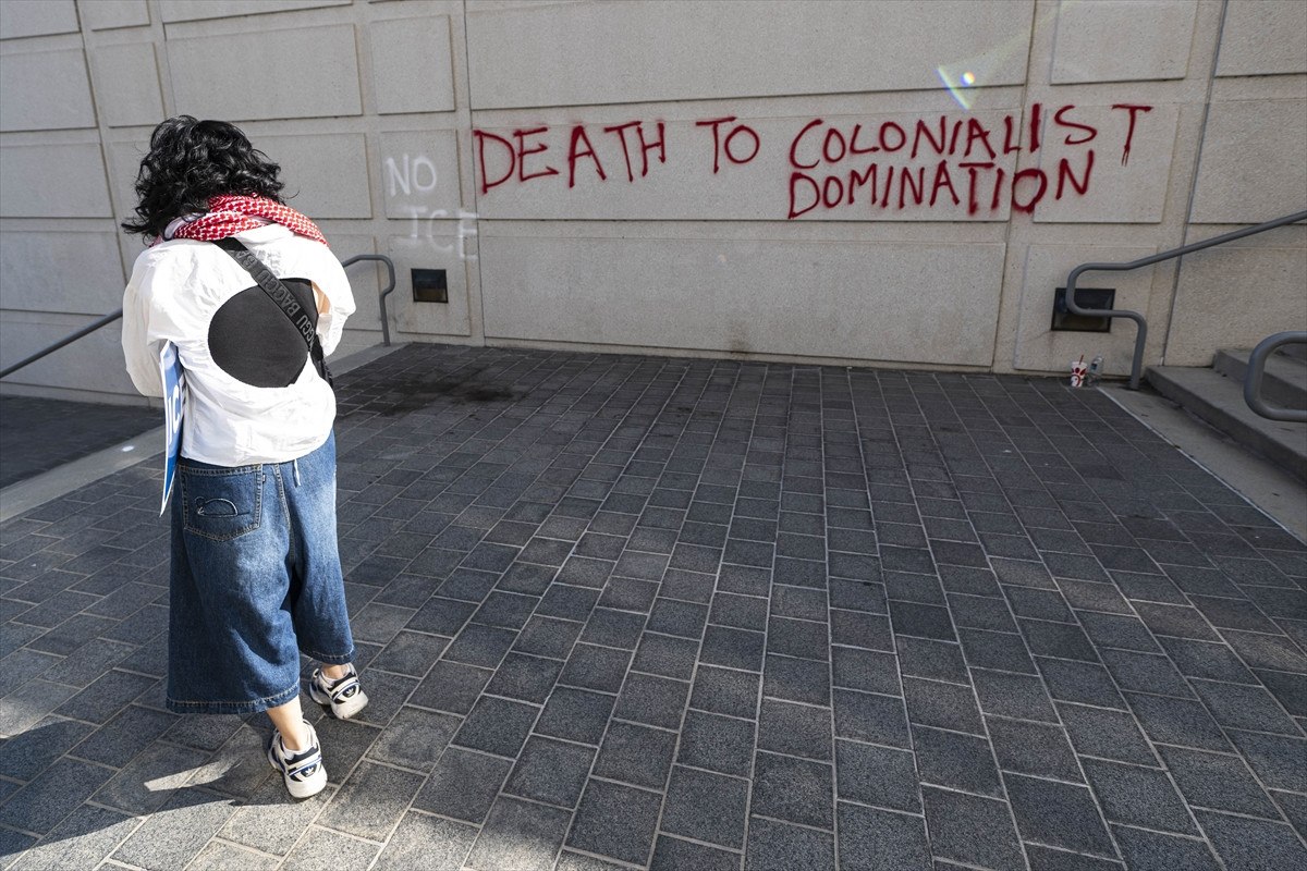 Federal Binanın önünde bir araya gelen göstericiler, yasa dışı göçmenlerin tutuklamasına karşı protesto gösterisi düzenledi.