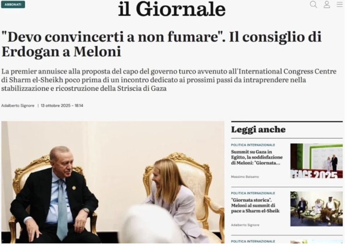 Cumhurbaşkanı Recep Tayyip Erdoğan’ın Mısır’da İtalya Başbakanı Giorgia Meloni ile yaptığı görüşmede İtalyan lidere sigarayı bırakma tavsiyesi vermesi de İtalya ve dünya basınında yer bulan diyaloglardandı.