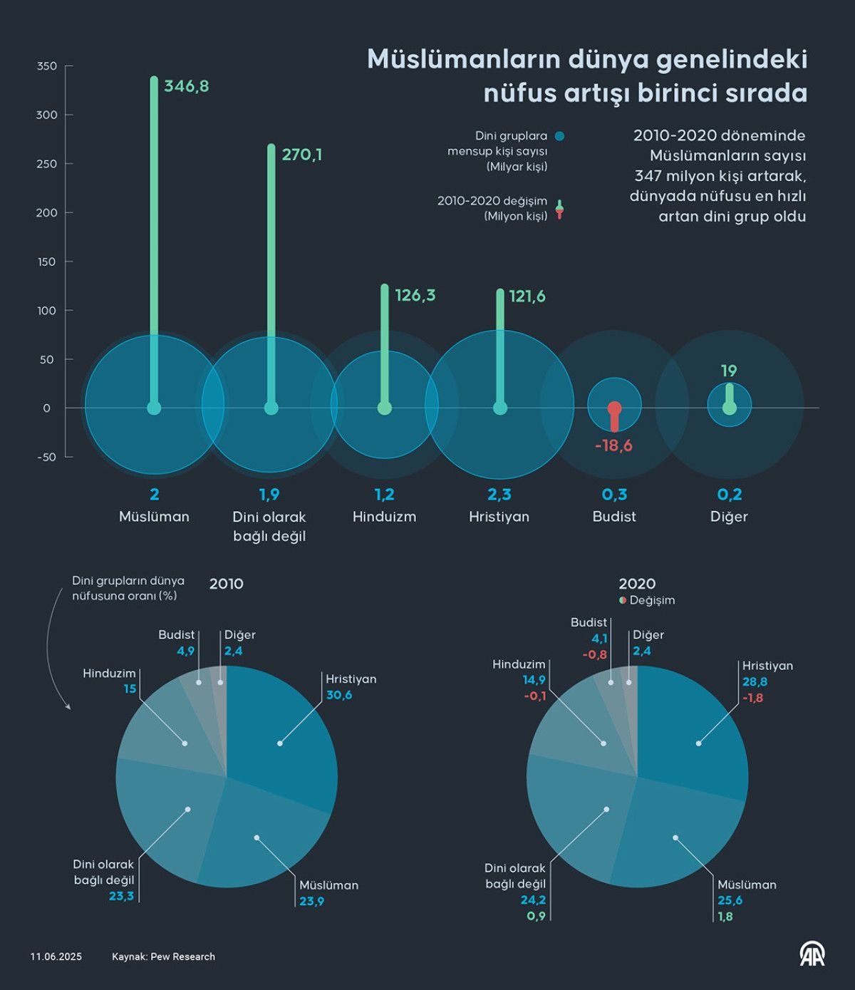 Raporda, 10 yılı aşkın süre içinde 347 milyon kişi artan Müslüman nüfusunun, diğer dinlere oranla en hızlı artış gösterdiği ortaya konuldu, bunun, Müslüman toplumlarda doğal nüfus artışından kaynaklandığı belirtildi.