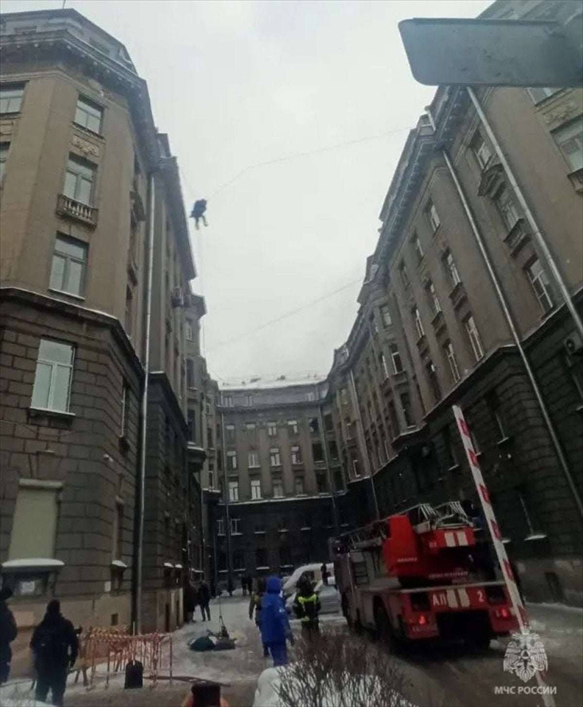 Rusya’da çatıdan düşen görevli son anda kurtuldu