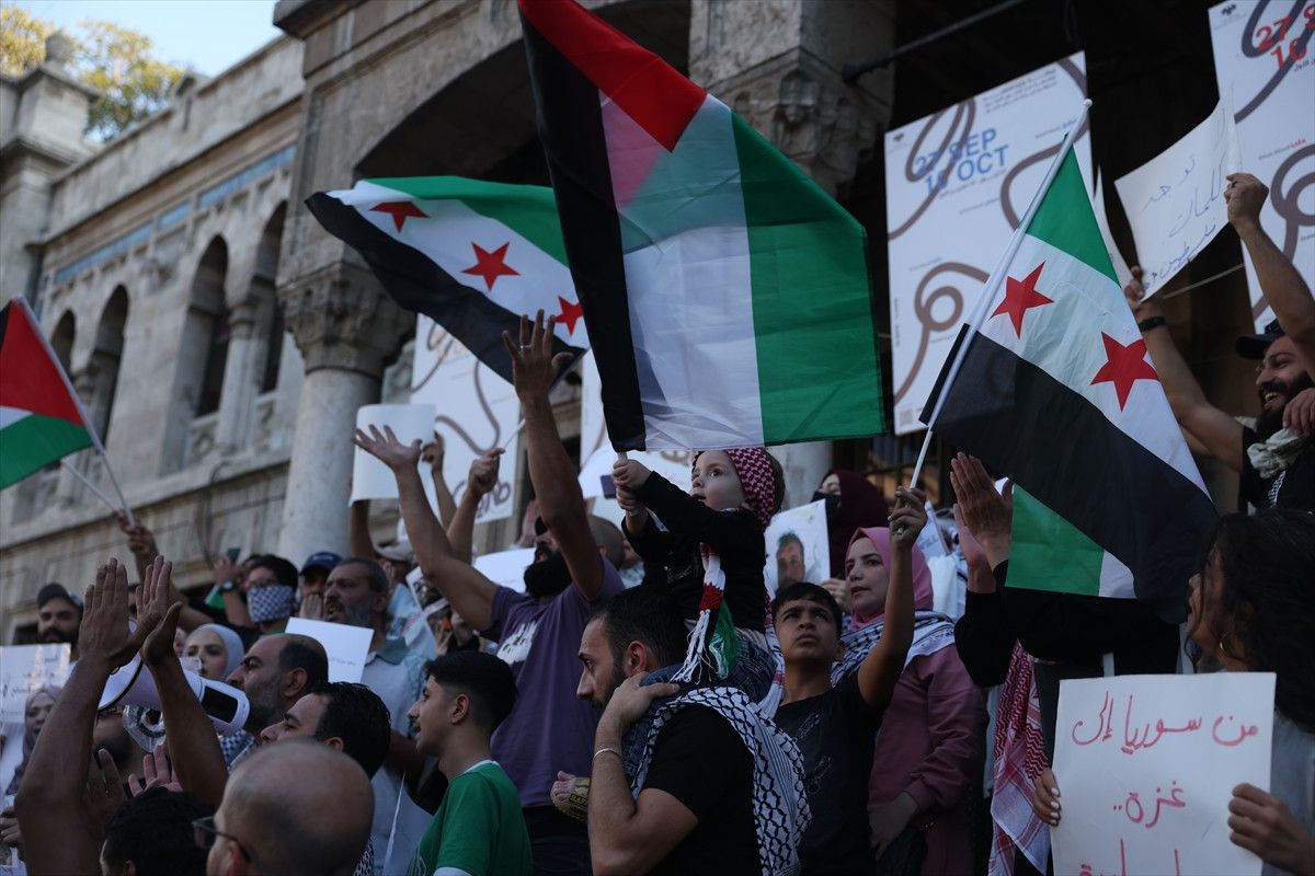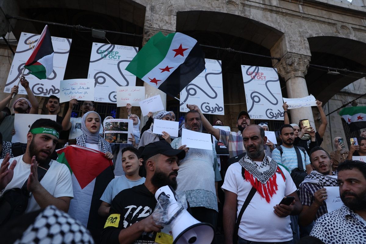 Hicaz Meydanı’nda bir araya gelen göstericiler, “Aksa bizimdir”, “İsrail ile normalleşmeye hayır”, “Golan toprakları Suriye’nindir”, “Hepimiz Gazze’yiz” ve “Hepimiz Sumud Filosu’yuz” şeklinde Arapça, İbranice ve İngilizce yazılı dövizler taşıdı.