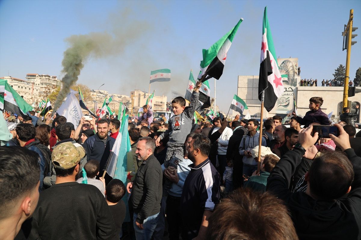 “Özgür Suriye” sloganı atan binlerce kişi, Suriye devrimi ile özdeşleşen çeşitli şarkılar söyleyerek Baas rejiminin devrilmesini kutladı.