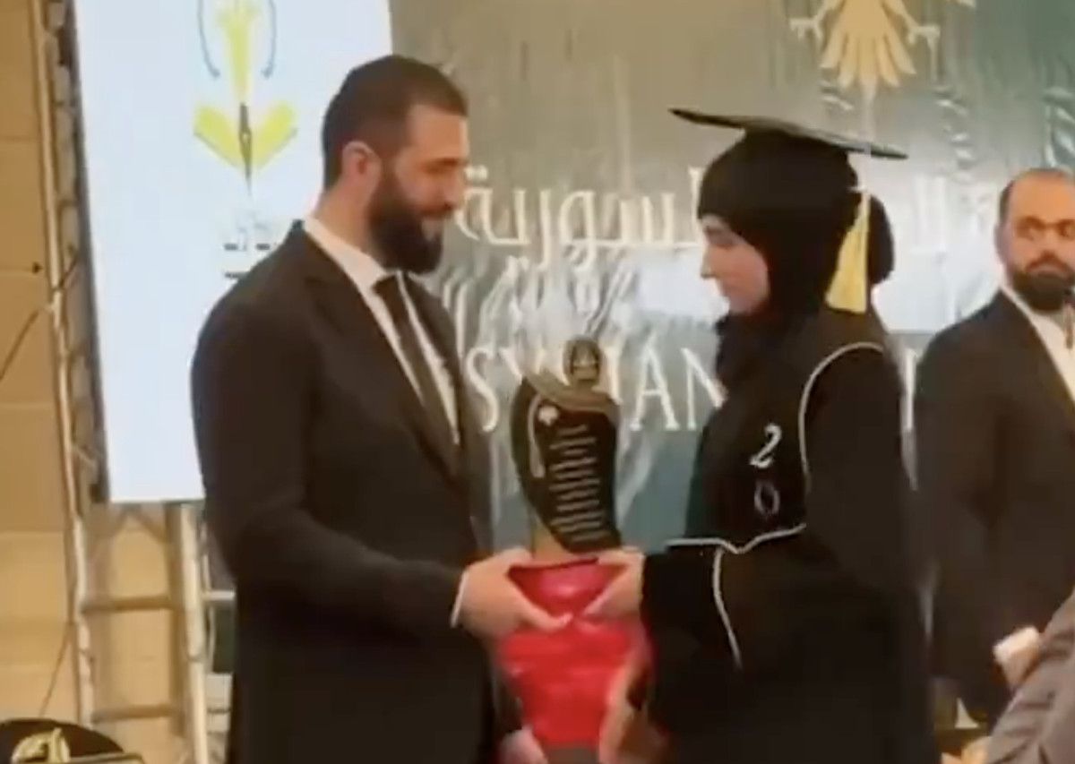 Ahmed Şara, eşi Latife Durubi’nin, İdlib Üniversitesi Edebiyat ve Beşerî Bilimler Fakültesi’ndeki mezuniyet törenine katıldı.