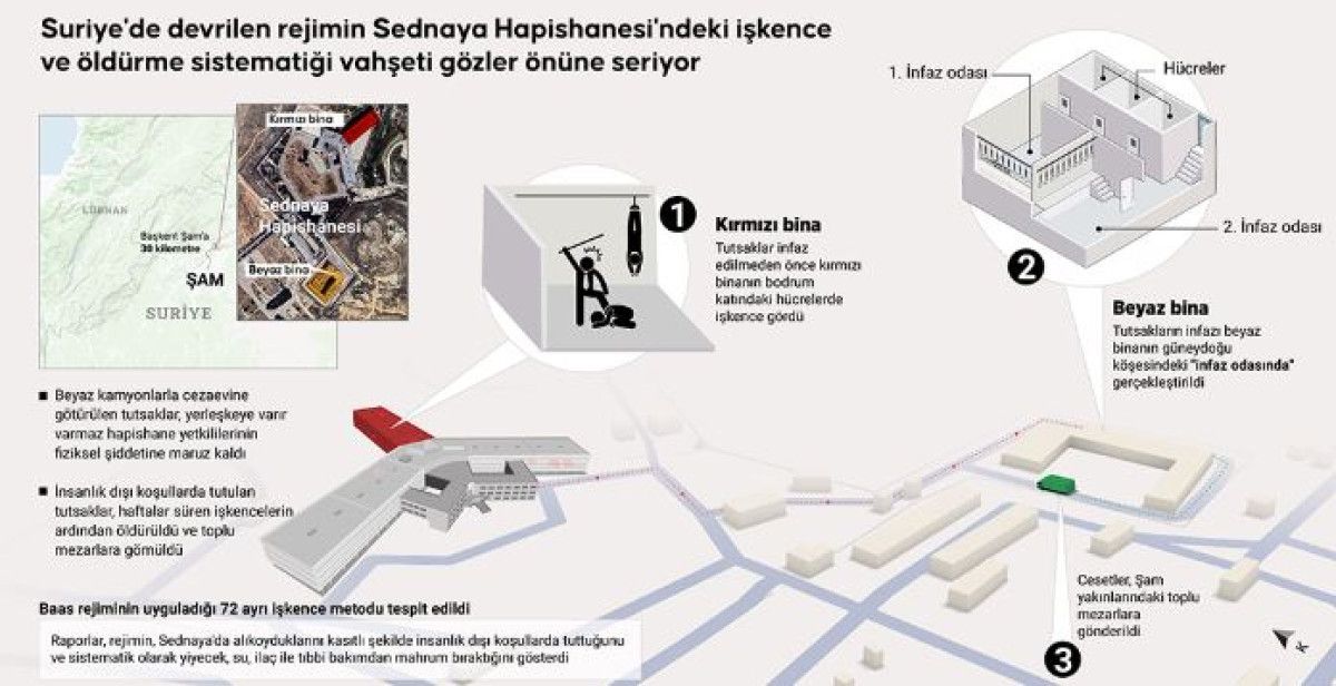 Sednaya’daki işkence ve infazlara ilişkin açık kaynaklardan derlenen bilgilere göre, cezaevi yerleşkesinde, “beyaz bina” ve “kırmızı bina” olarak adlandırılan 2 gözaltı tesisi bulunuyor.