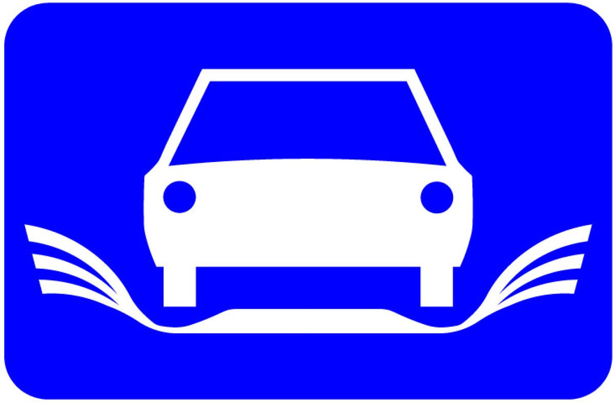 Belçika’da kullanılan ve Avrupa’nın bazı ülkelerinde de rastlanan bu özel tabela, GiII tipi bilgi levhası kategorisinde yer alan simgede yer alan “kanatlar”, lastik altından sıçrayan suyu temsil ediyor.