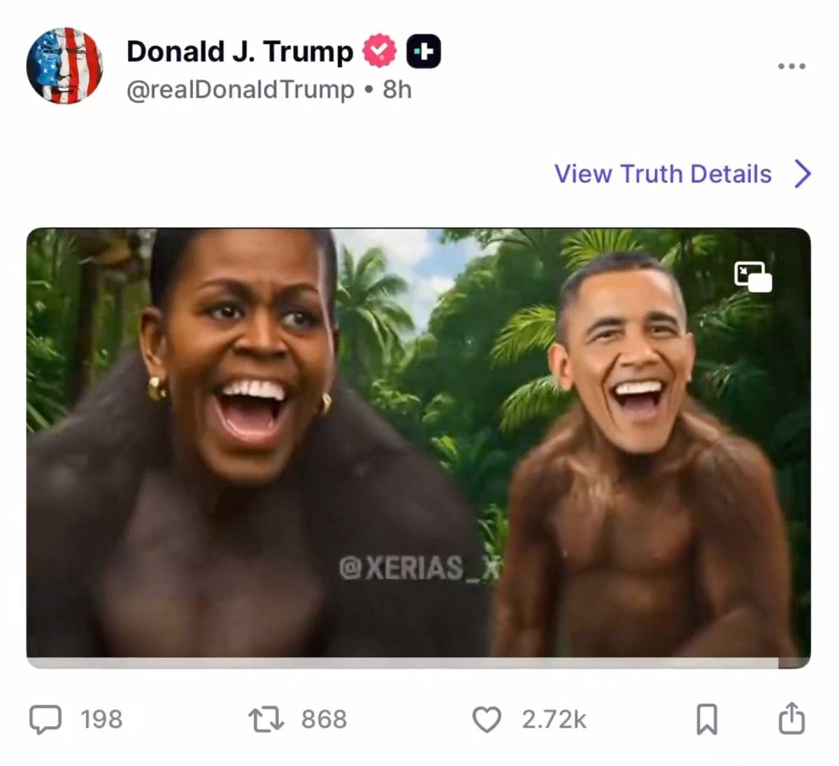 ABD Başkanı Donald Trump, eski başkan Barack Obama ve eşi Michelle Obama’nın kafalarının maymun bedenlerine yerleştirilmiş bir şekilde tasvir edildiği ırkçı bir bölüm de içeren bir video paylaştı.