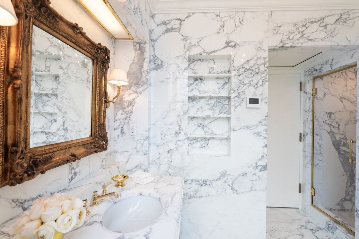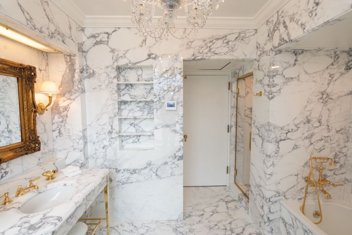 Trump, banyoyu siyah-beyaz cilalı Statuary mermeriyle kaplattığını söyledi. Banyonun bazı kısımlarının altın kaplama olması dikkat çekti. Trump, mermerin Lincoln döneminde de kullanılmış olabileceğini savundu.