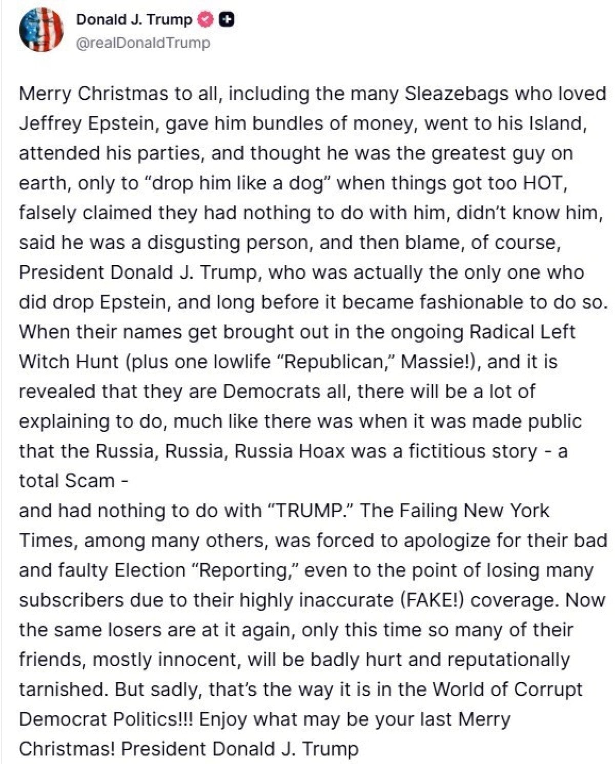 Herkese mutlu Noeller dileyen Başkan Trump, “Jeffrey Epstein’i seven, ona yığınla para veren, adasına giden, partilerine katılan ve onu yeryüzünün en harika adamı sanan onca ahlaksız dâhil.” ifadelerini kullandı.