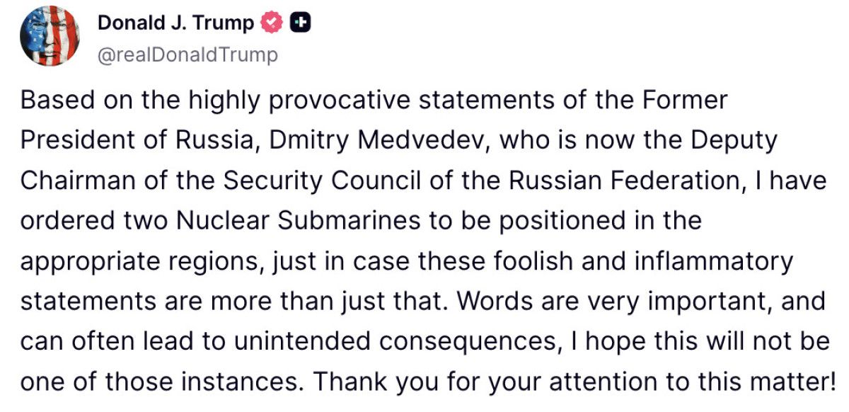 ABD Başkanı Donald Trump, eski Rusya Devlet Başkanı Medvedev’in açıklamalarına tepki olarak, “iki nükleer denizaltının uygun bölgelere yeniden konuşlandırılması” emrini verdiğini şu sözlerle ilan etti: