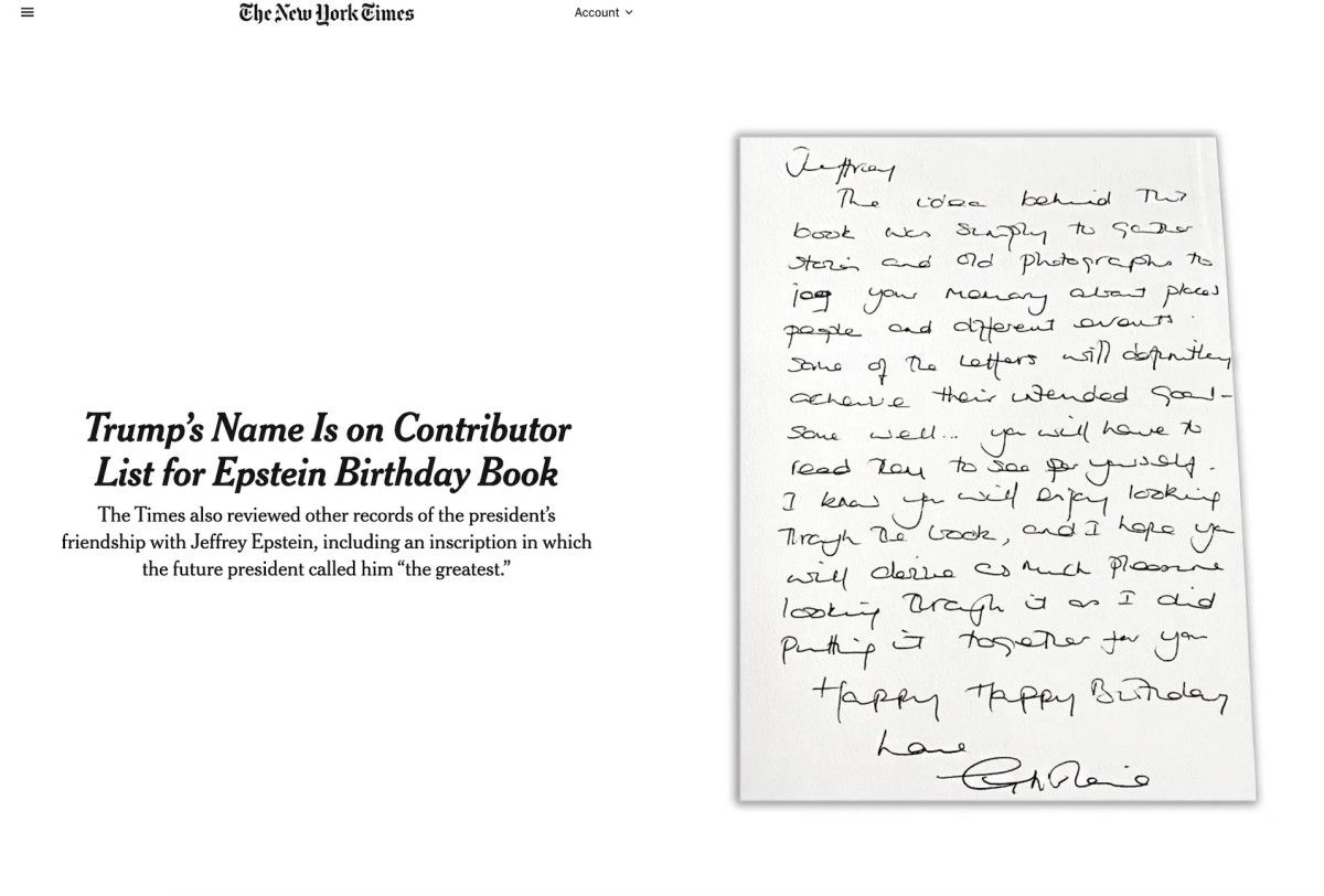 New York Times ise, Donald Trump’ın da albüme “Jeff, sen en büyüksün!” şeklinde bir not yazdığını doğruladı. Trump’ın 1997’de yayımlanan “Trump: The Art of the Comeback” kitabını Epstein’a imzaladığı ve kitabın içindeki notla hayranlığını dile getirdiği belirtildi. Trump, haberlerin ardından Wall Street Journal ve ilgili kişiler aleyhine hakaret davası açtı.