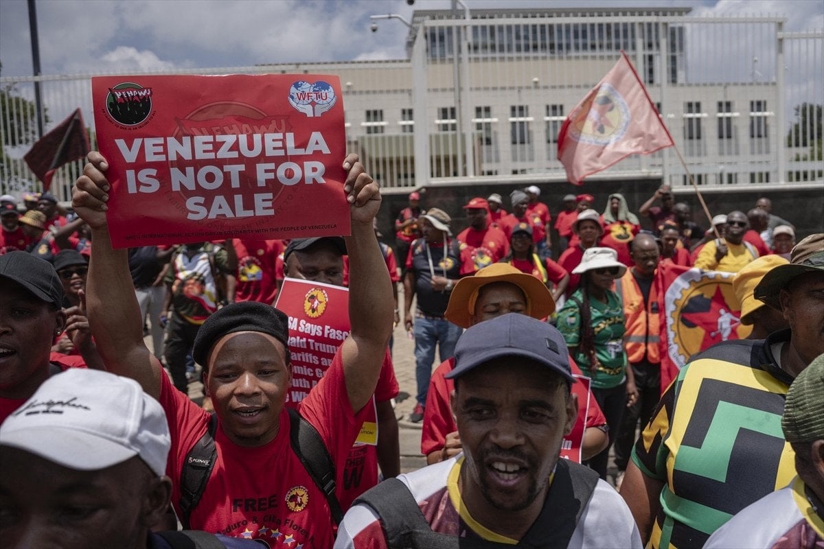 Venezuela’nın başkenti Caracas’taki tarihi Bolivar Meydanı’nda (Plaza Bolivar de Caracas) toplanan Venezuelalılar, ABD’yi protesto ederken, diğer yandan Maduro’nun serbest bırakılması ve ülkeye dönmesi için topluca dua etti.