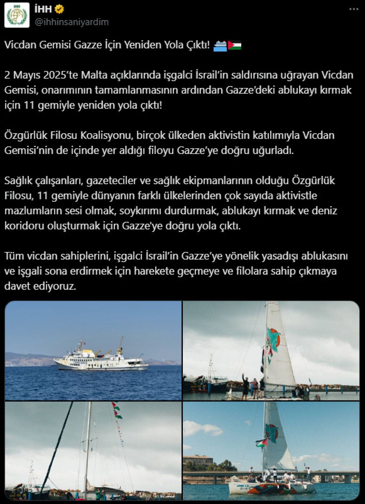 Yapılan paylaşımda, “Tüm vicdan sahiplerini, işgalci İsrail’in Gazze’ye yönelik yasadışı ablukasını ve işgali sona erdirmek için harekete geçmeye ve filolara sahip çıkmaya davet ediyoruz.” ifadeleri kullanıldı.