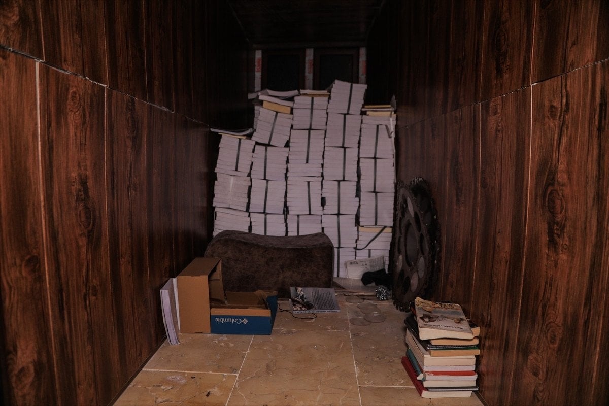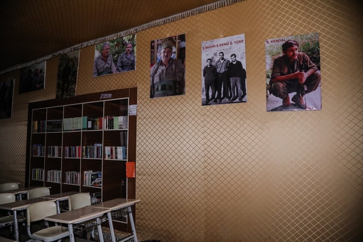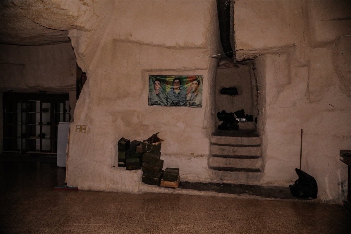 Yapının içerisinde örgüt sembollerinin yanı sıra tünellerin kazılması için kullanılan araç ve gereçlerin de sergilendiği görülüyor.