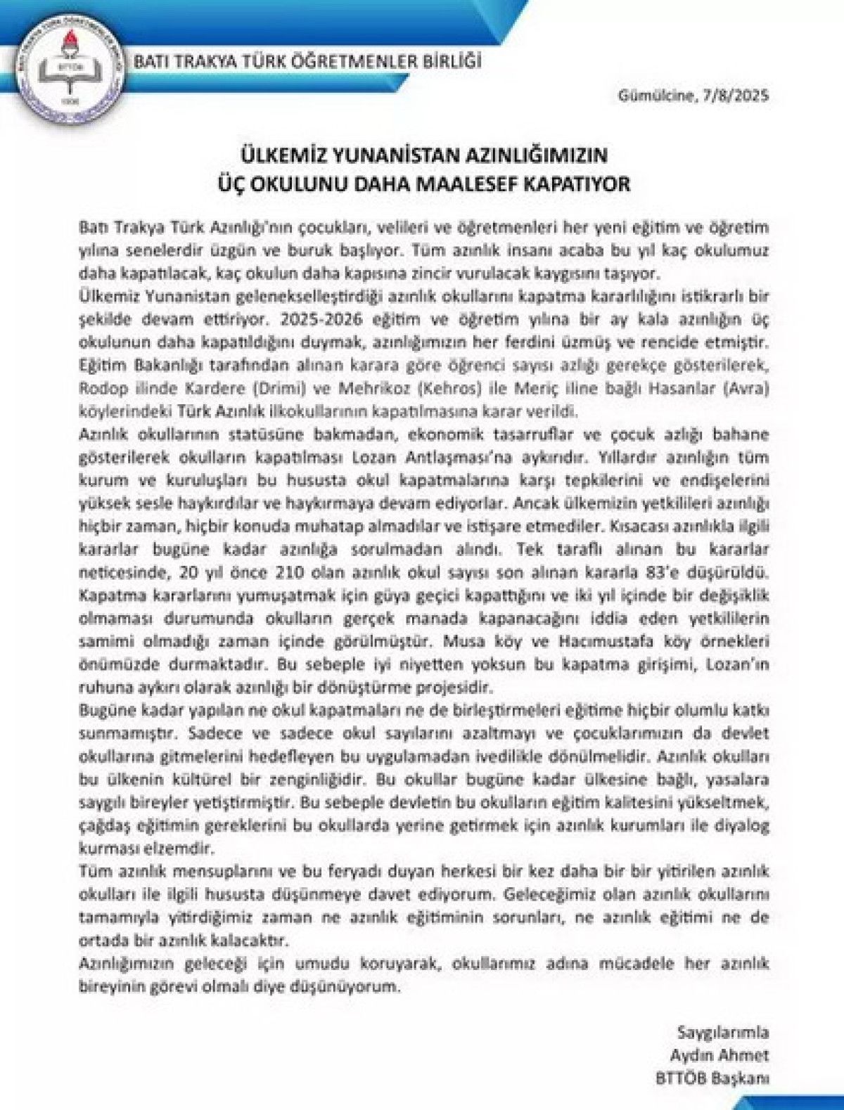 Batı Trakya Türk Öğretmenler Birliği (BTTÖB) Başkanı Aydın Ahmet, yayınladığı açıklamada Yunanistan’ın uygulamalarının Lozan Antlaşması’na aykırı olduğunu vurguladı: