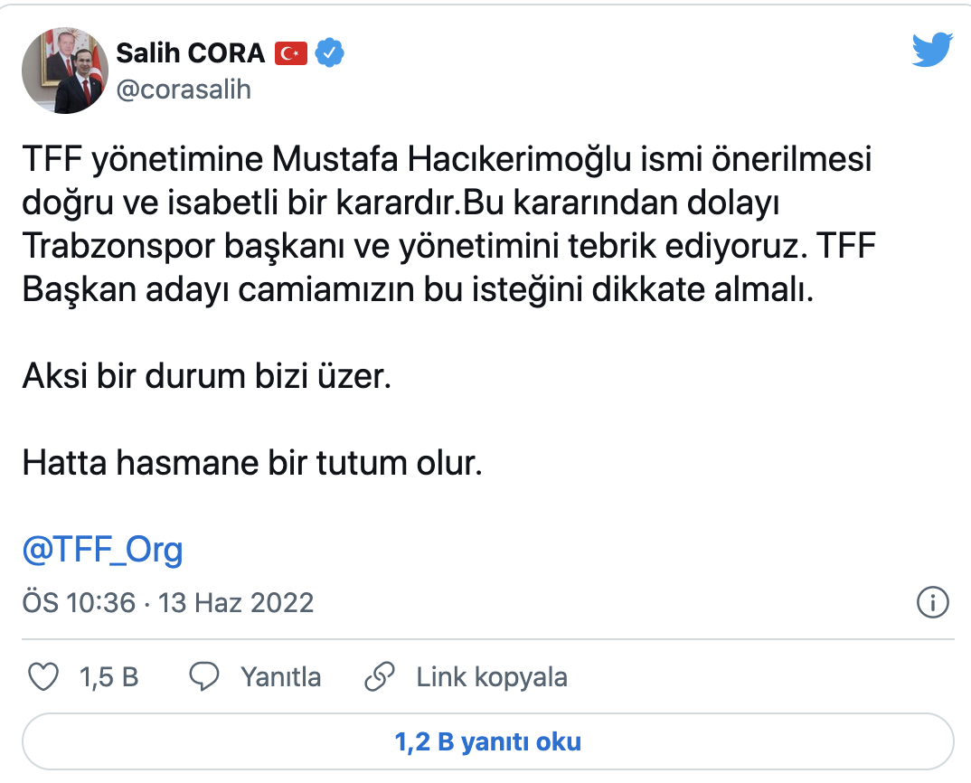Salih Cora, Twitter hesabından dün attığı tweet’te, “TFF idaresine Mustafa Hacıkerimoğlu ismi önerilmesi gerçek ve isabetli bir karardır. Bu kararından ötürü Trabzonspor lideri ve idaresini tebrik ediyoruz. TFF Lider adayı topluluğumuzun bu isteğini dikkate almalı. Aksi bir durum bizi üzer. Hatta hasmane bir tavır olur” dedi. Cora’nın ‘bizi üzer’, ‘hasmane’ (düşmanca) üzere sözleri bilhassa kullanması dikkat çekti.