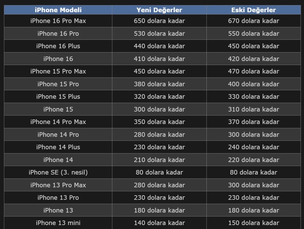 Yayımlanan yeni listeye göre şirketin en güncel amiral gemisi iPhone 16 Pro Max’in takas değeri 670 dolardan 650 dolara geriledi.
