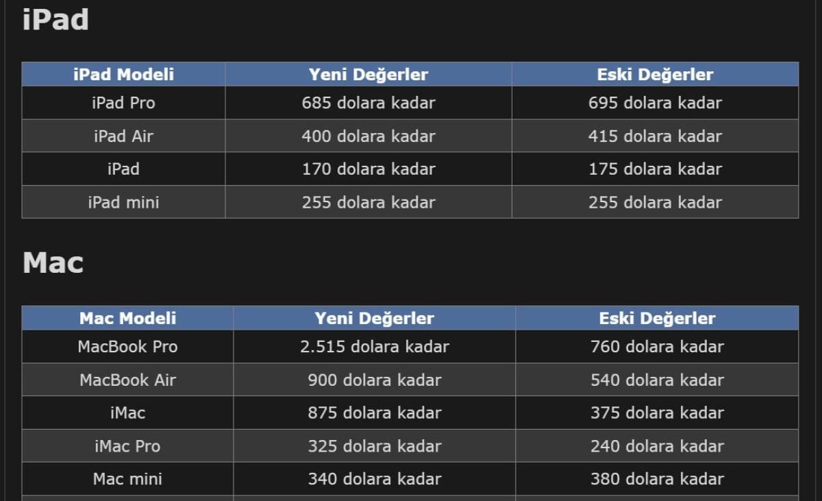 Teknoloji devi Apple, Amerika Birleşik Devletleri’nde geçerli olmak üzere iPhone, iPad, Mac ve Apple Watch modellerini kapsayan takas değerlerinde kapsamlı bir güncellemeye gitti.