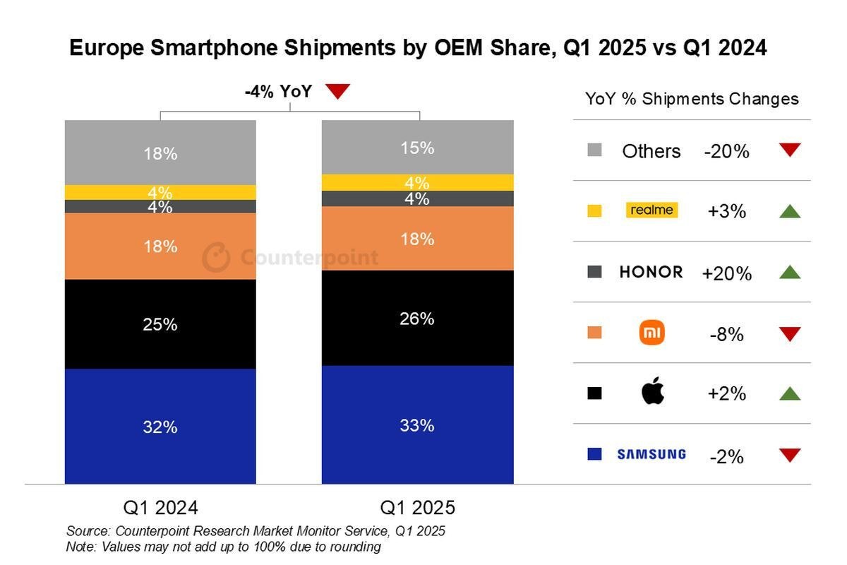 Counterpoint Research verilerine göre, 2025’in ilk çeyreğinde Avrupa akıllı telefon pazarı, bir önceki yılın aynı dönemine kıyasla yüzde4 oranında daraldı.