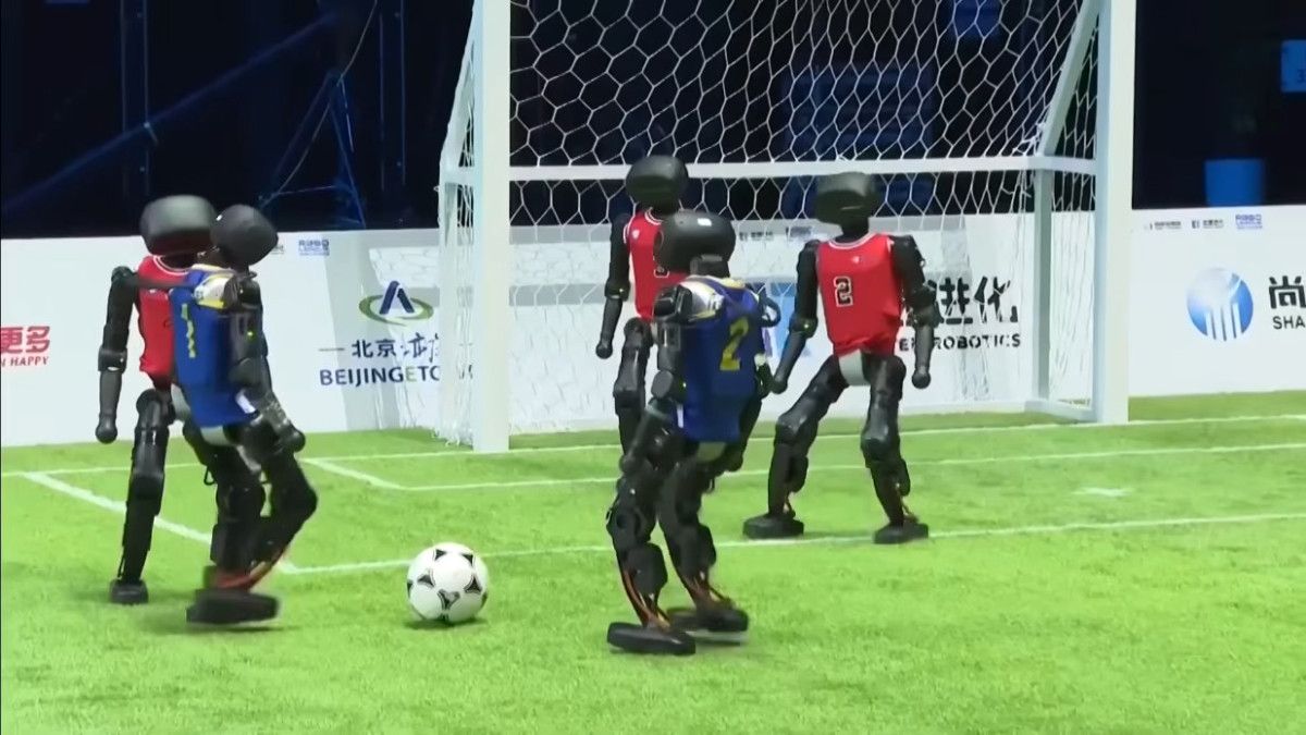 Siyah ve mor forma giyen insansı robotlar, iki 10 dakikalık yarıdan oluşan bir maç yaptı ve bir takım sahadan 5-3 galip ayrıldı.