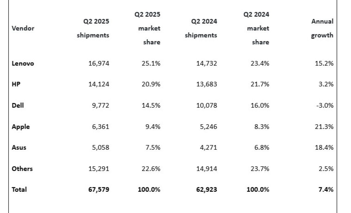 Araştırma şirketi Canalys’in son verilerine göre, küresel PC sevkiyatları 2025 yılının ikinci çeyreğinde yıllık bazda yüzde 7,4 artarak 67,6 milyon adede ulaştı.