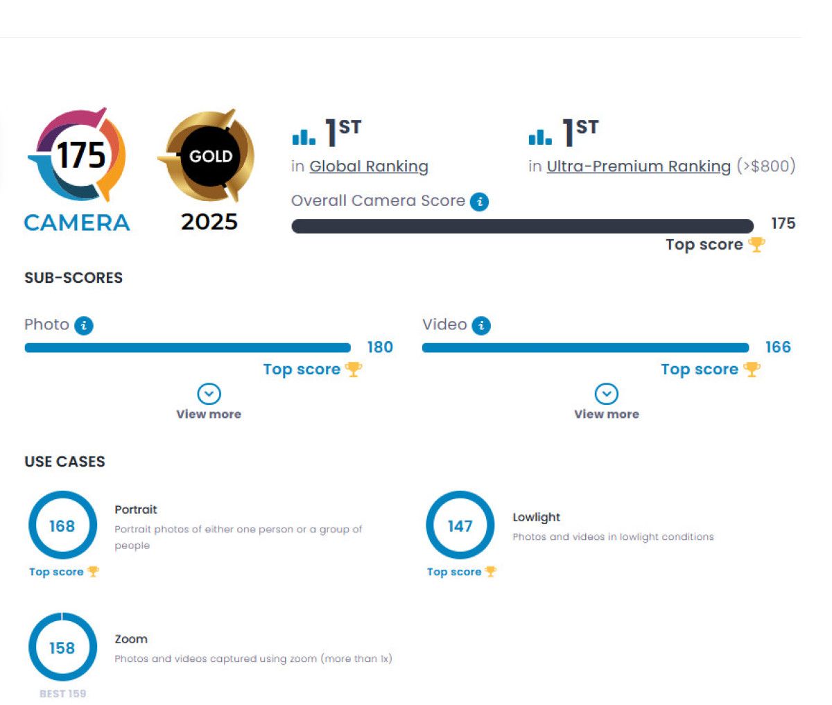 Cihazın başarısı sadece genel puanla sınırlı kalmadı; 180 fotoğraf ve 166 video puanı alarak her iki kategoride de dünyanın en iyisi olmayı başardı.