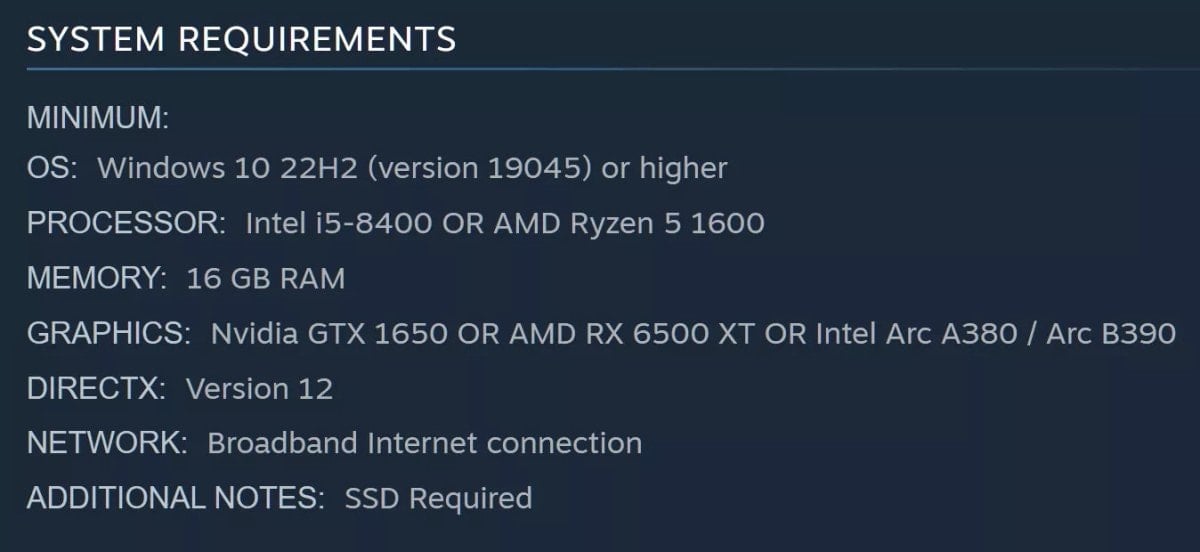 Oyunun açıklanan minimum gereksinimlerinde Intel i5-8400 veya AMD Ryzen 5 1600 işlemci ile birlikte 16 GB RAM ve zorunlu SSD depolama alanı talep ediliyor.