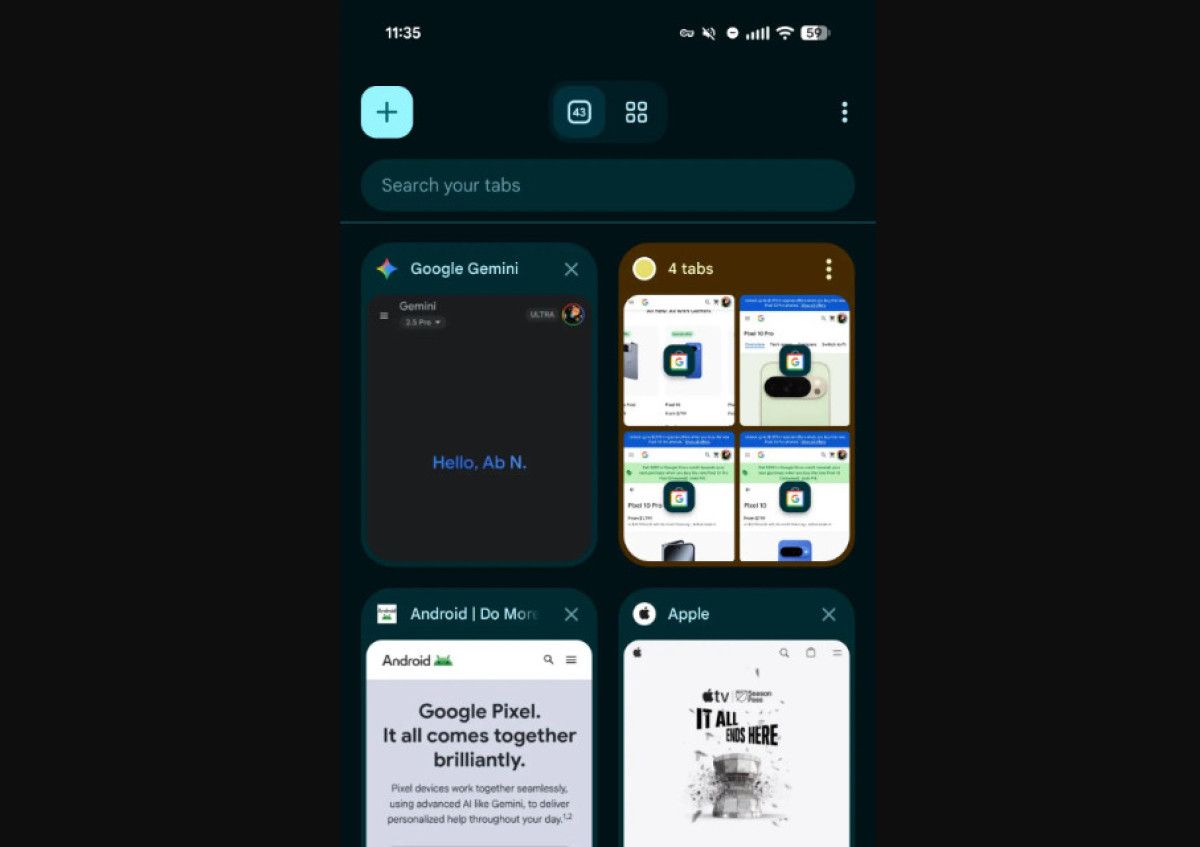 Sekme görünümünde ise yeni sekme butonu yuvarlatılmış bir kare içine alınırken, seçilmeyen sekme gruplarının çerçeve rengi artık telefonun temasına göre değişiyor.