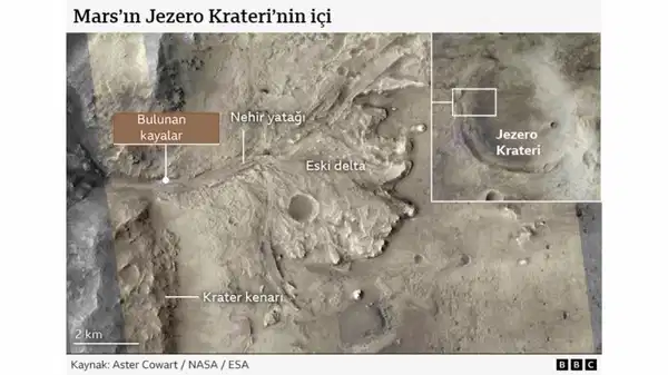 Mars soğuk ve kurak bir çöl ama milyarlarca yıl önce kalın bir atmosfere ve suya sahipti; bu da geçmiş yaşamı aramak için umut verici bir ortam yaratıyor. 2021’de Mars’a inen Perseverance Rover, biyolojik izler aramak üzere gönderilmişti. Dört yıldır eski bir göl olan ve içine bir nehrin aktığı Jezero Krateri’ni keşfediyor.