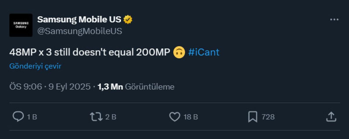 Samsung’un ilk eleştirisi iPhone 17’nin kamerasına yönelik oldu. Şirket, yeni modeldeki 48 MP kameranın, kendi 200 MP’lik sensörüne kıyasla çok geride kaldığını ve bu sayının üç katının bile 200’e ulaşamadığını vurguladı.