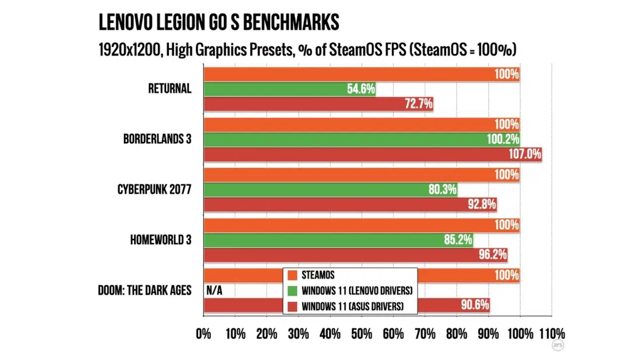ArsTechnica’nın Lenovo Legion Go S test sonuçlarına göre SteamOS 2025 yılında taşınabilir konsollar için daha iyi bir seçenek gibi duruyor. Hatta yapılan testlere göre oyunlar SteamOS’ta Windows 11’e kıyasla daha iyi ve hızlı çalışıyor.