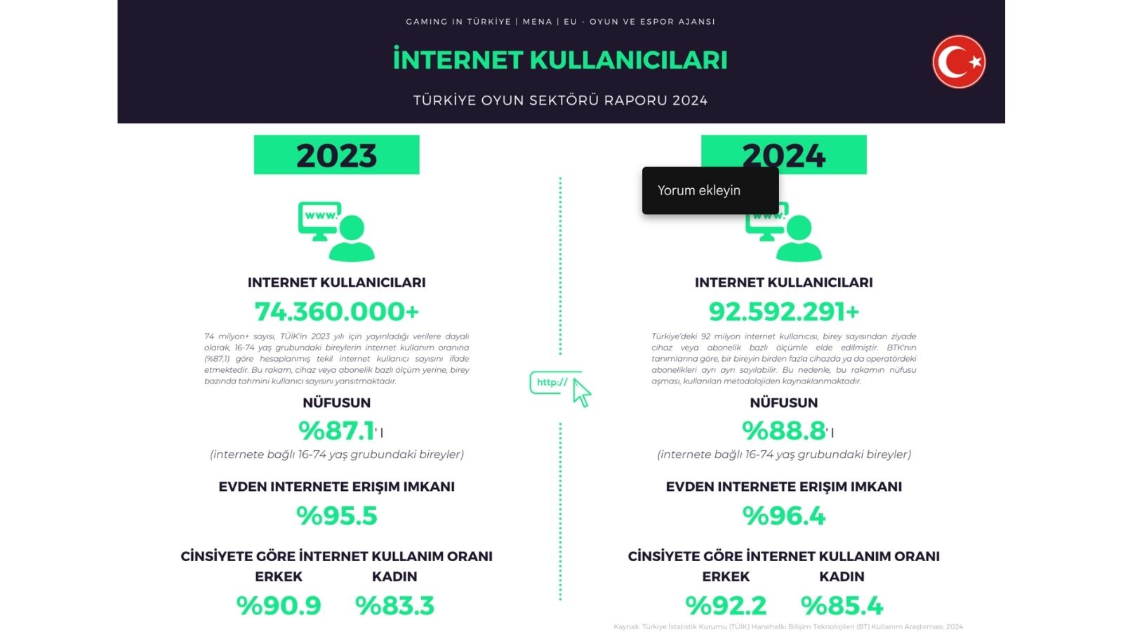 Türkiye Oyun Dalı 2024’te yer alan bilgilere nazaran; Türkiye’de 92.5M+ üzerinde internet kullanıcısı bulunuyor. 2023 yılında %87,1 olan internet kullanıcılarının toplam nüfusa oranı, 2024’te %88.8’e yükseldi. 2024 yılında ülkemizdeki toplumsal medya kullanıcısı evvelki yıl ile aynı kalırken, toplumsal medyada geçirdiğimiz mühlet ise azaldı. Türkiye’nin 70M+/- toplumsal medya kullanıcısı, 2024 yılında bu mecralarda günlük ortalama 2 saat 40 dakika geçirdi.