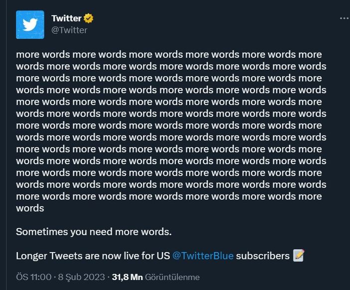 Güncellemenin duyurusunu Twitter’dan yapan şirket, paylaştığı tweet’te ‘’MoreWords’’, yani ‘DahaFazlaKelime’’ tabirlerini kullandı.