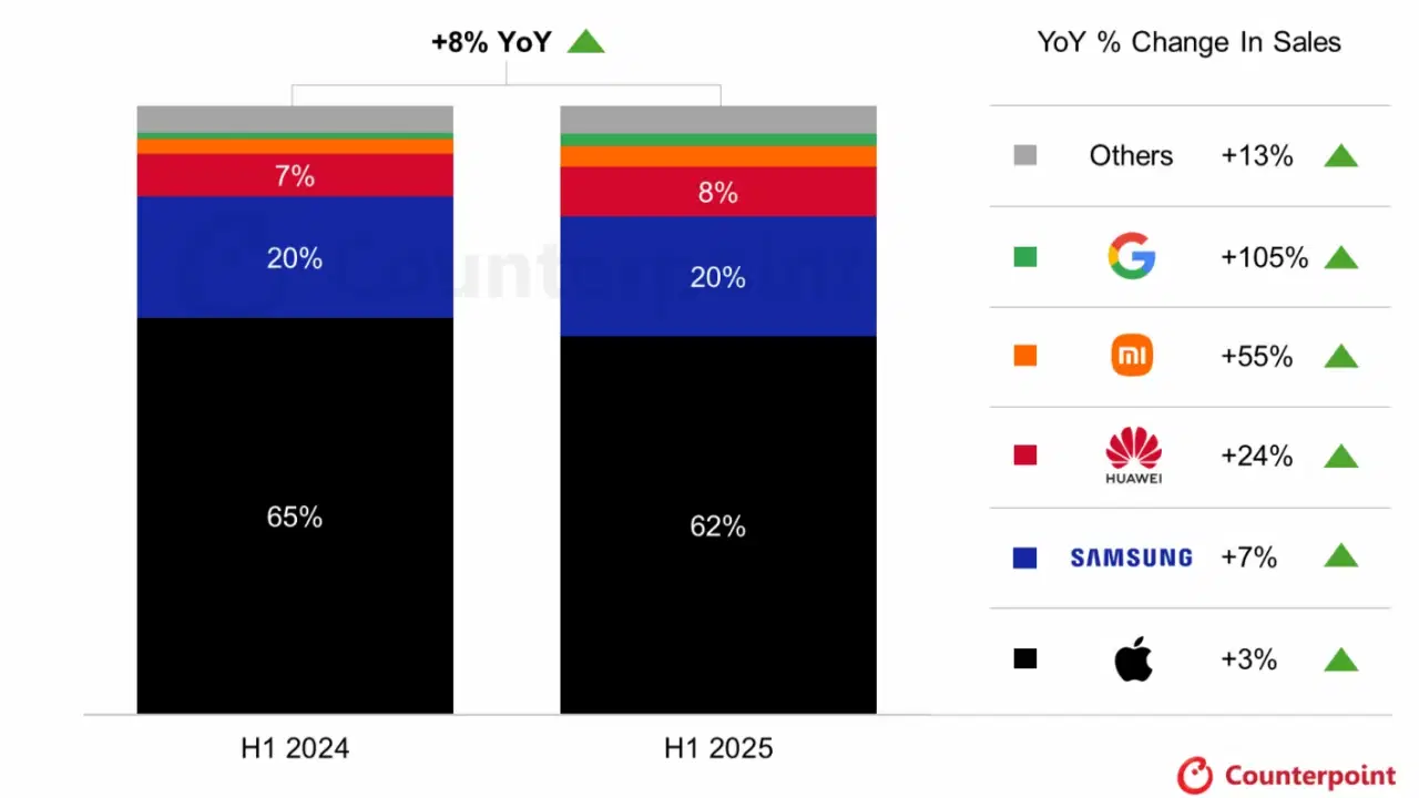 Model model listelenmese de Apple geçen yıla kıyasla yüzde 3’lük bir büyüme kaydetti ve bu listenin başında yer alıyor. En çok üst segment telefon satan marka olan Apple’ı Samsung ve Huawei takip ediyor. Apple yüzde 62’lik bir pazar payına sahipken, Samsung yüzde 20 ile ikinci sırada yer alıyor. Huawei, Amerika pazarında satış yapamıyor olsa da Çin’deki ve diğer Avrupa ülkelerindeki satışlar yüzde 8’lik bir dilime denk geldiğini gösteriyor. Huawei, 24’lük bir artış da kaydetmiş.